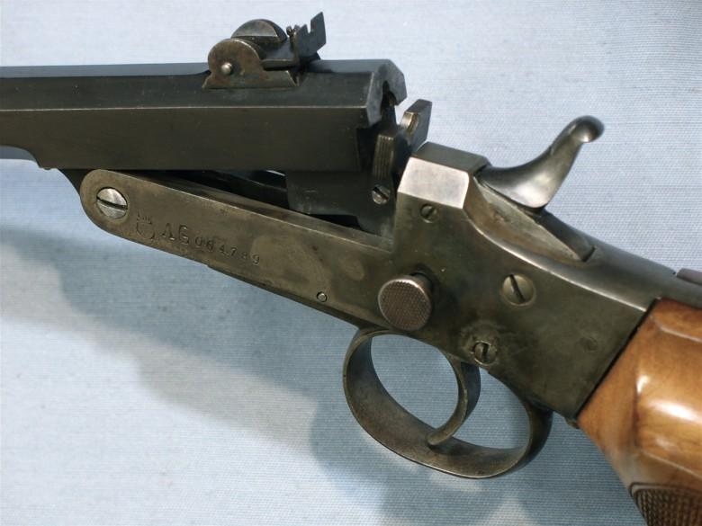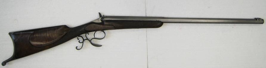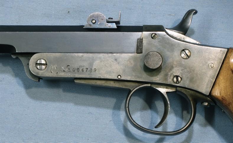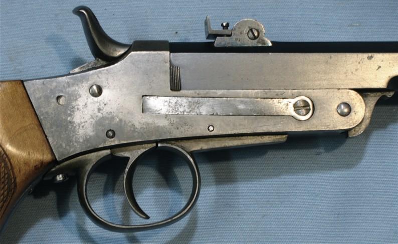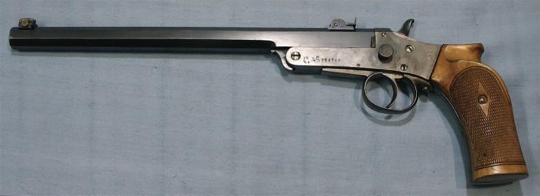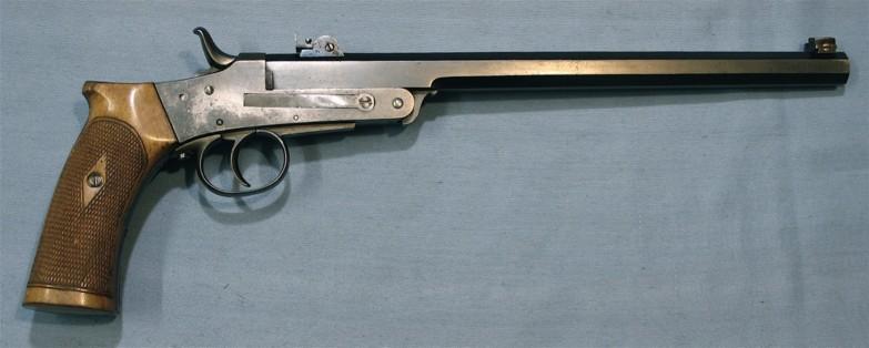 Very beautiful pistol of shooting and/or stand of caliber 22 Flobert. The barrel with eight sides and very length as it is appropriate for a weapon of shooting of precision .It have a rectangular handlebar and a system of rise to lifting screw. The stick in drowning squared is studied to improve the catch in hand and precedes the current anatomical grips.