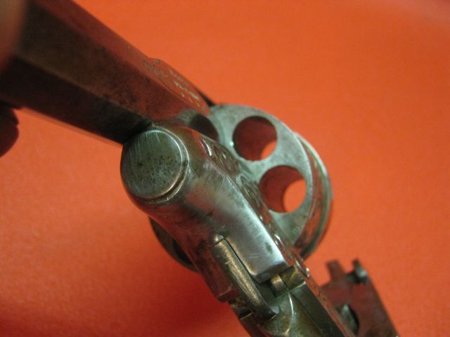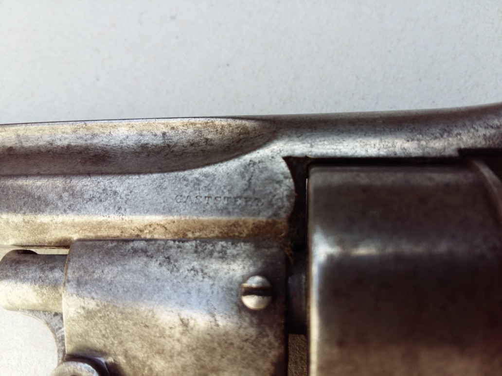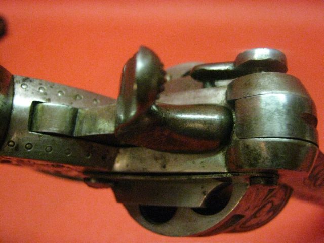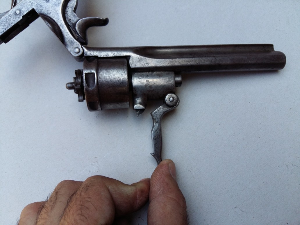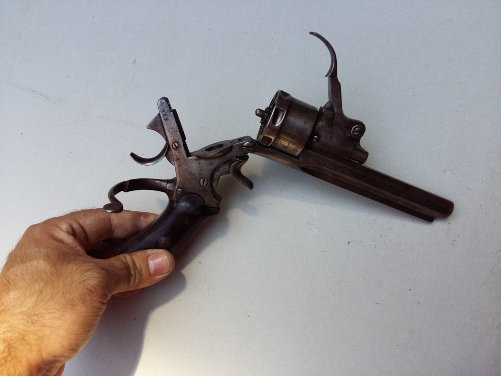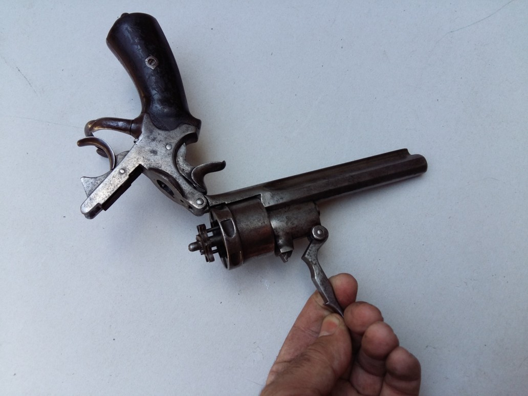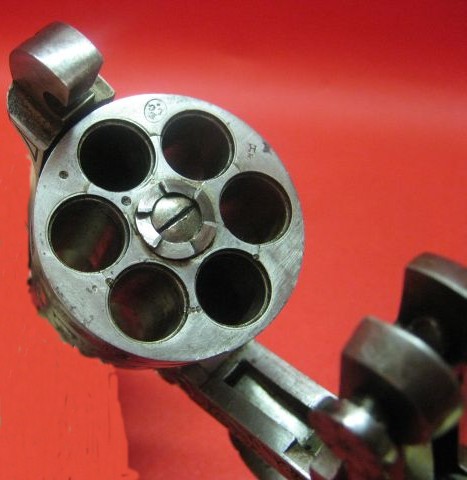 Revolver with central percussion with top break of gauge not communicated. The barrrel-cylinder unit related to the carcass by a screw-pivot, rocks forwards when one actuates the button of opening placed on the left at the top of the carcass. Rocking is intended to facilitate the loading/unloading since there is no door. This rocking actuates a visible metal strip under the console and which takes support on before trigger guard to push back the star extractor.