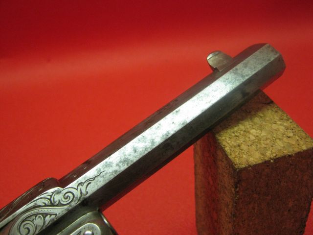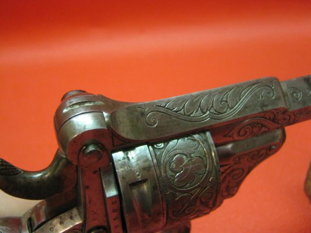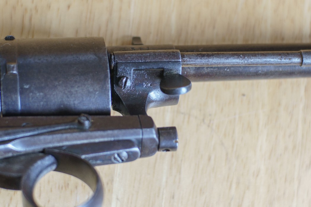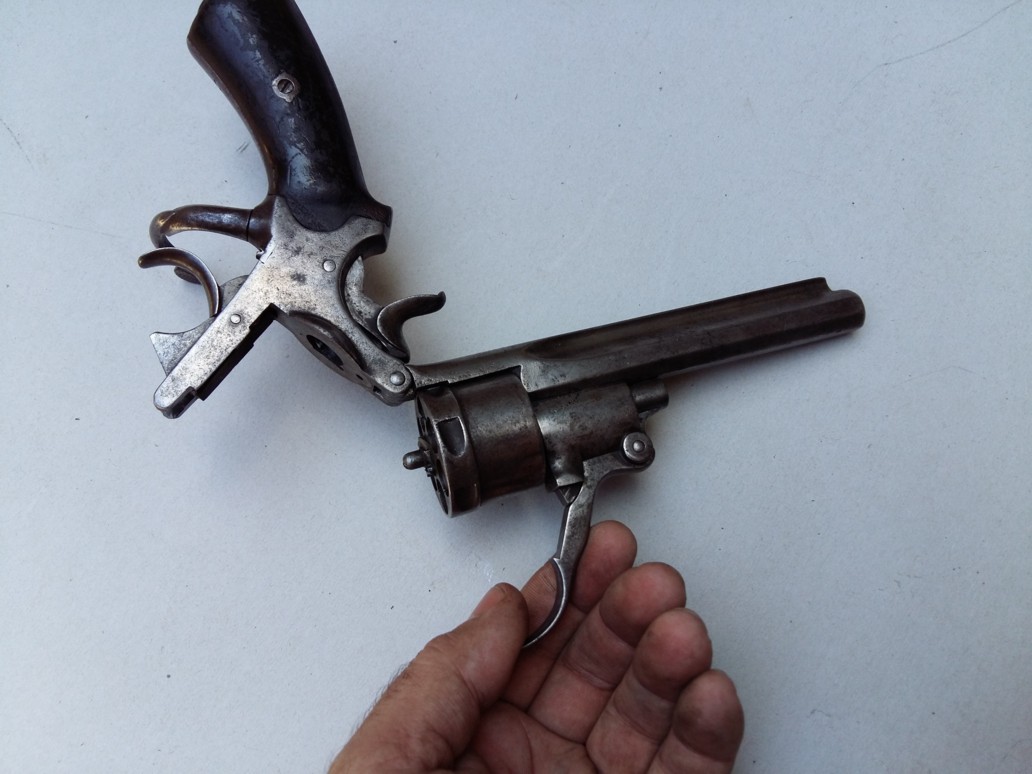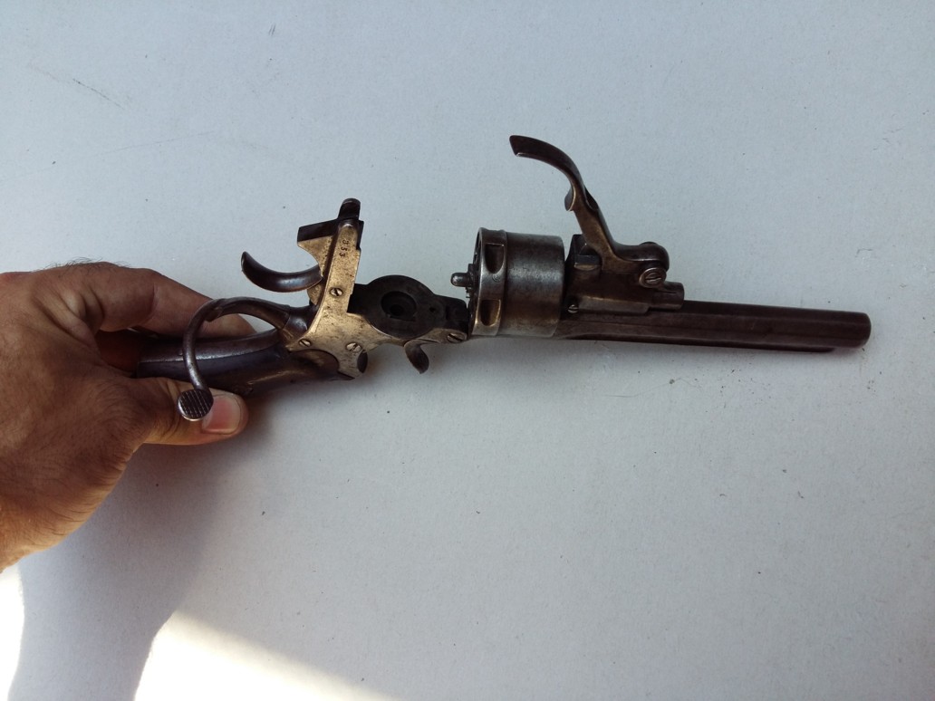 Here is a revolver for pinfire cartridges of unspecified caliber which was of beautiful invoice. The barrel is extended by a part ending in "u" to ensure its attachment to the frame by means of two screws.