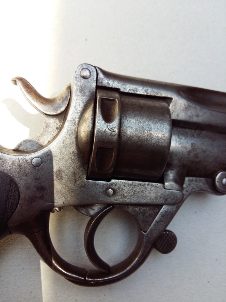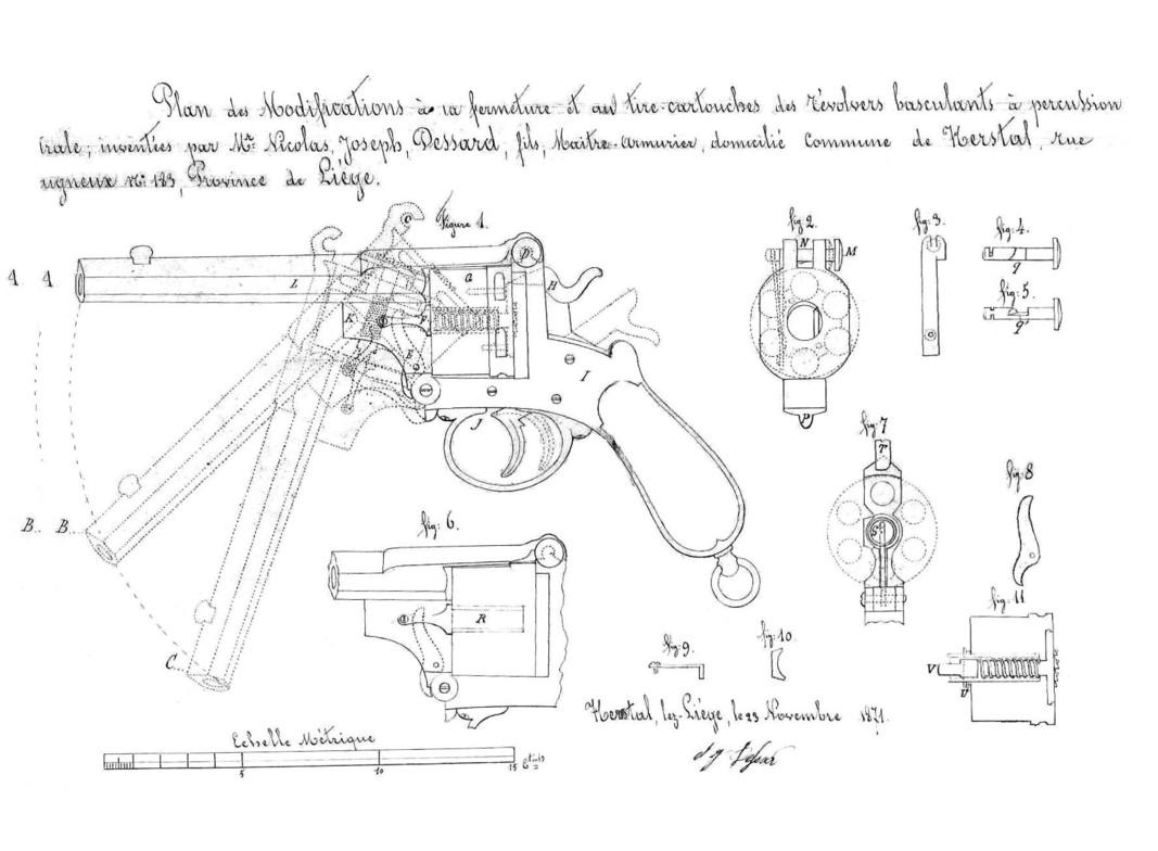 This weapon is the subject of the patent n° 029659 of the 23.11.1871 for a system of closing and extraction for revolver. See drawing of patent in appendix.