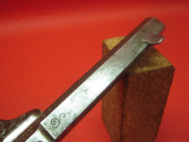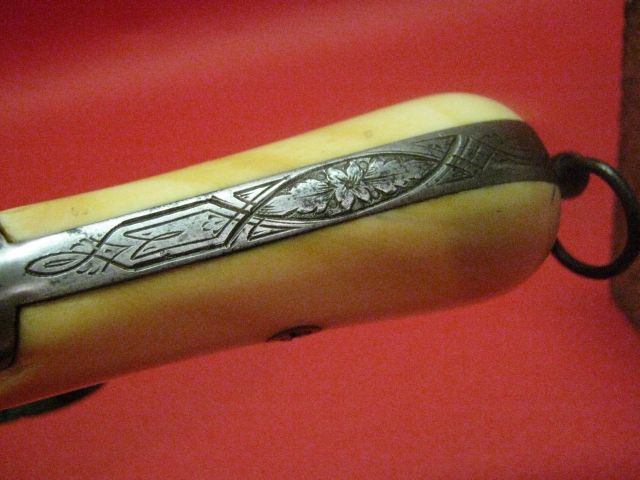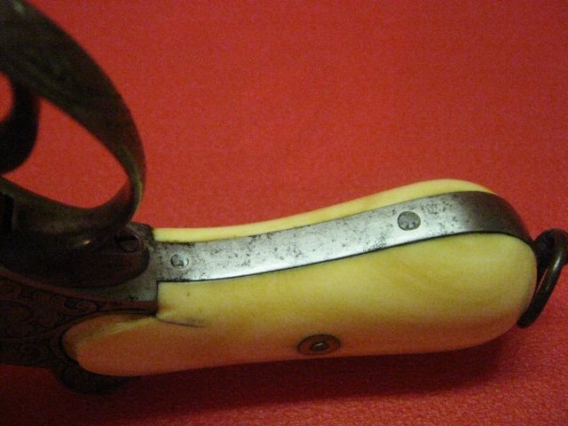The grips consists of two plates in bone seems to me it because the bone yellowed into growing old while the ivory remains white. These plates are maintained by a transverse screw and two brass rivet washers.