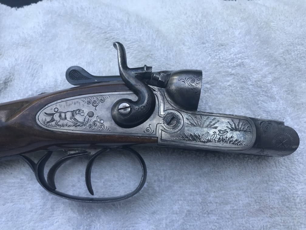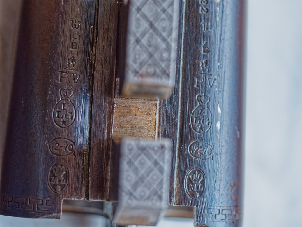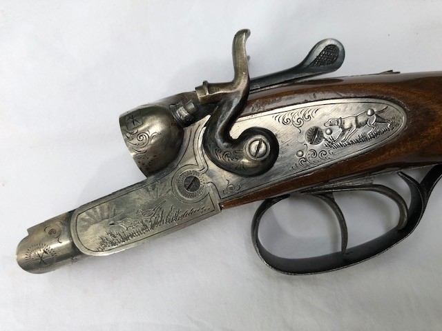 Opening key between the hammers, pistol butt, engravings on the lock.