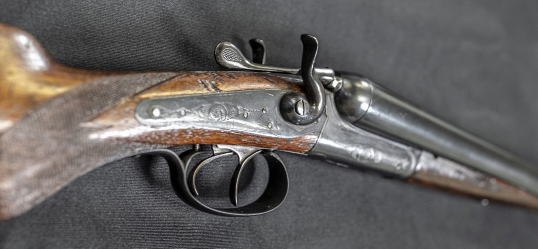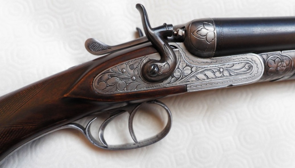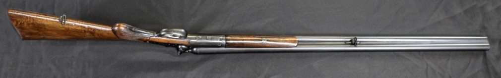 It acts of a shotgun to two shots with central percussion. The rocker is with key between the external hammers and the stick is English.