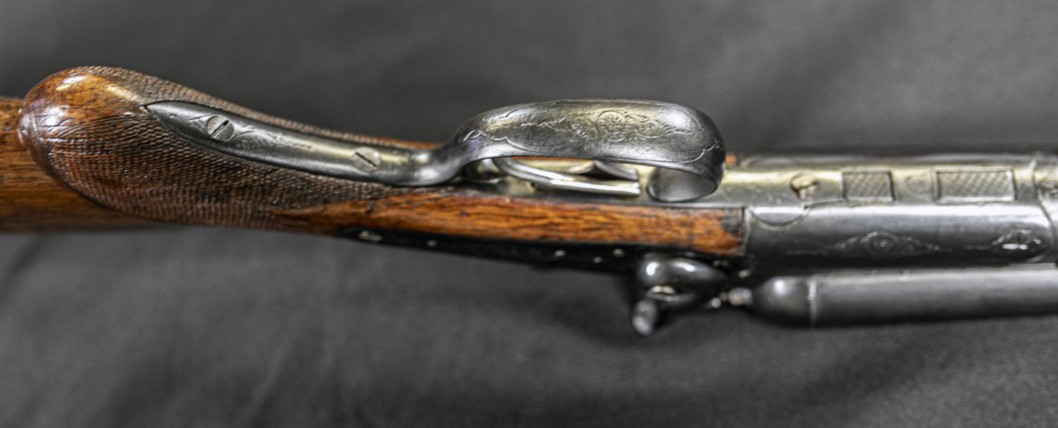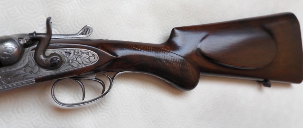 It acts here of a double-barreled rifle with central percussion, lock embedded and rebounding, key top lever between the external hammers. The stick is of English type.