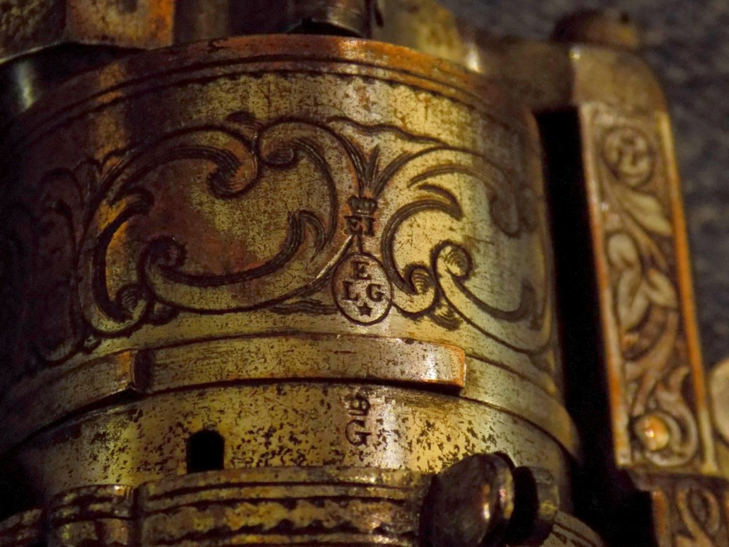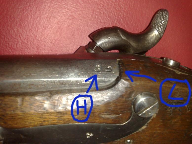 H et L dans un cercle : ce type de marquage n’était pas courant à Liège. Il m’est inconnu. Il pourrait peut-être s’agir de poinçons d’acceptation de l’unité suisse ayant réceptionné l’arme ?