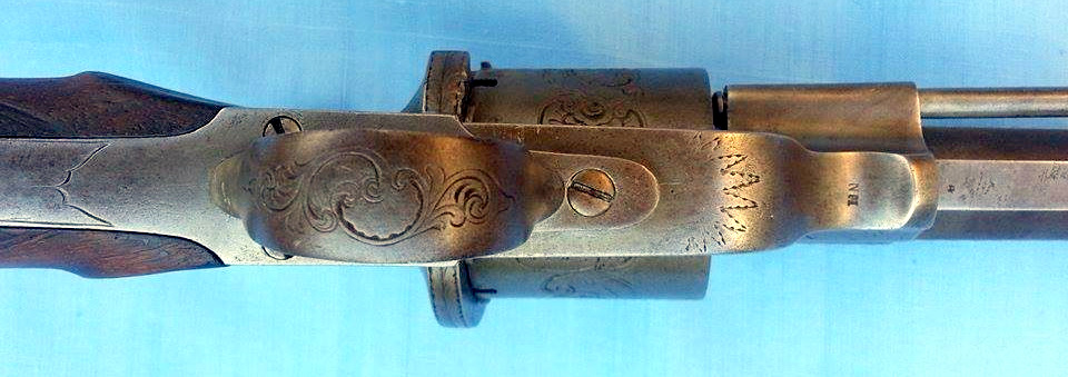 Quadruple sliding barrels for the loading, striker rotary, bronze carcass engraved.