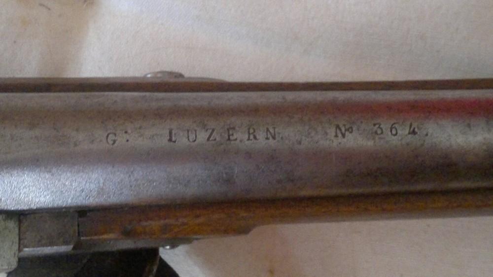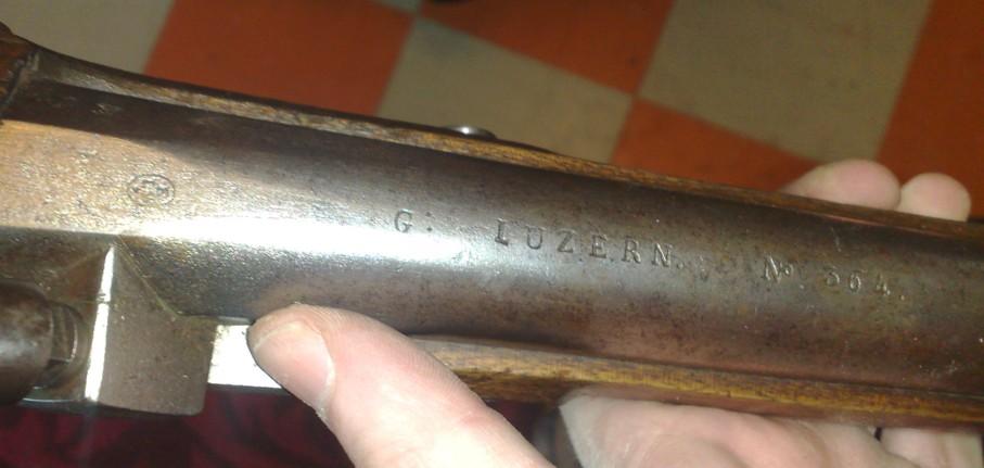Je pense que le marquage "G LUZERN 364" est l’ancien marquage militaire du canton de Luzern, mais ce que je trouve anormal c’est qu’il n’y a pas, du moins apparemment, le poinçon cantonal.