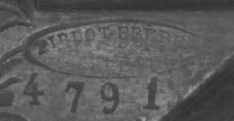PF dans un ovale (sur le bois) : en toute hypothèse il pourrait s’agir de la marque de fabrique de Pirlot Frères à Liège. Inscrits au banc d’épreuves de 1836 à 1879.