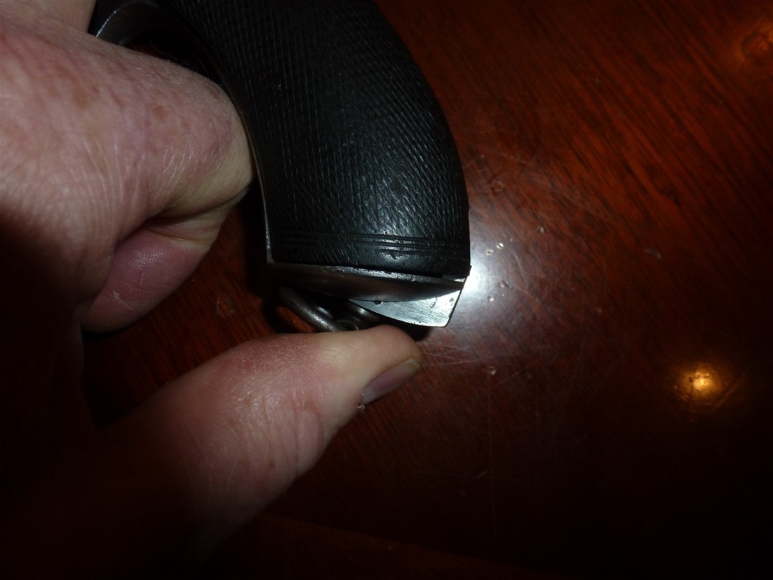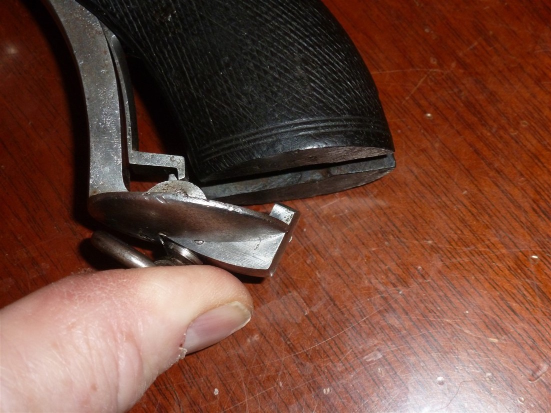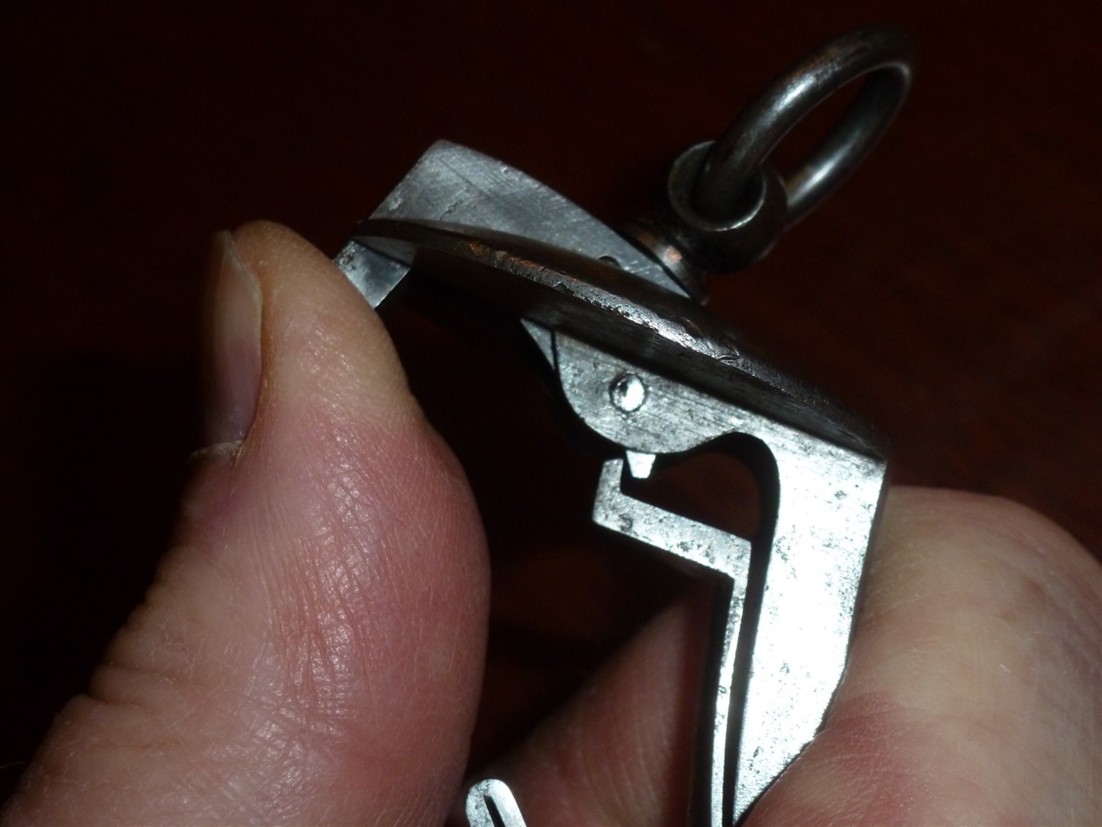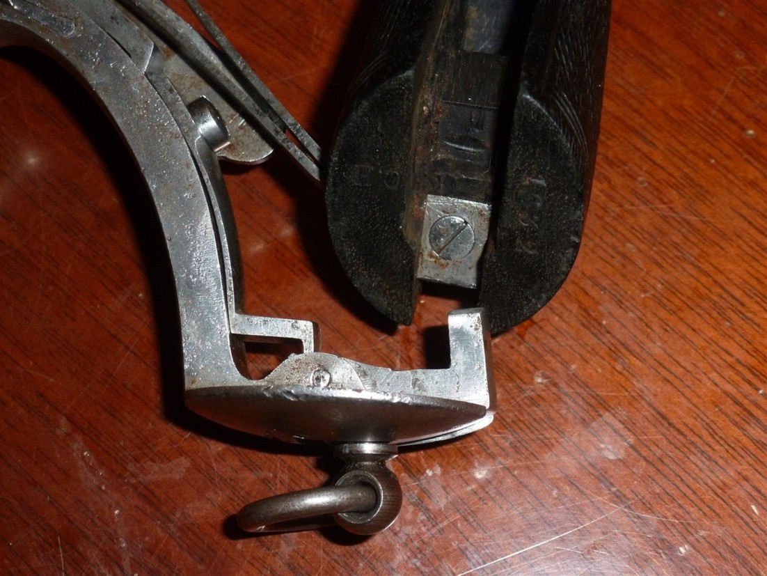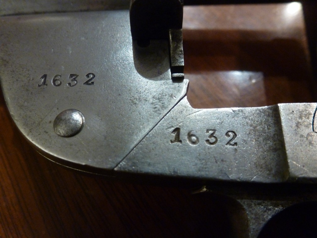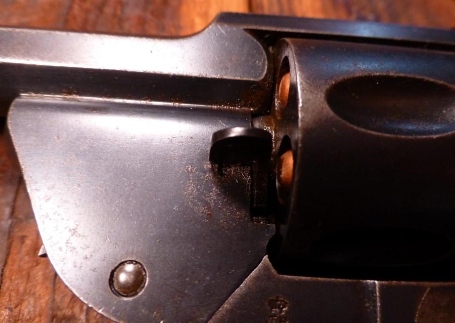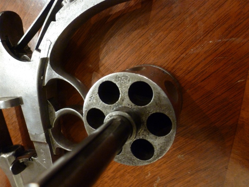It is about a revolver top break Dieudonné LEVAUX with central percussion. This weapon was the subject of a patent filling the 15/02/1876 under the n° 38750. (See page LEVAUX on the website) the cylinder is with 8 sides then round carries a rectangular front sight placed dovetail. The cylinder is with 6 shots. The calibre is not indicated. The grips consists of two plates of walnut squared joined together by a screw placed to the bottom of the grips, established fact rather unusual. The brass screws are with 2 notches and they claim a special screwdriver! This stick ends in a ring of cap and its screw-pivot.