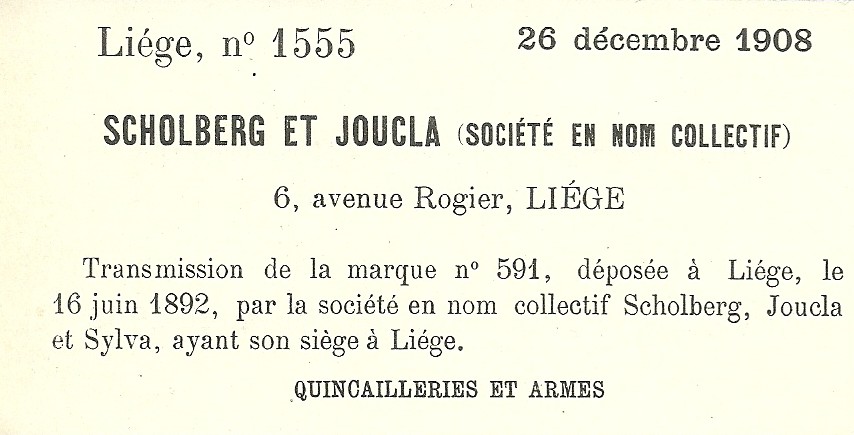 Scholberg & Gadet Company of Liege, Belgium (which manufactured this pistol) was