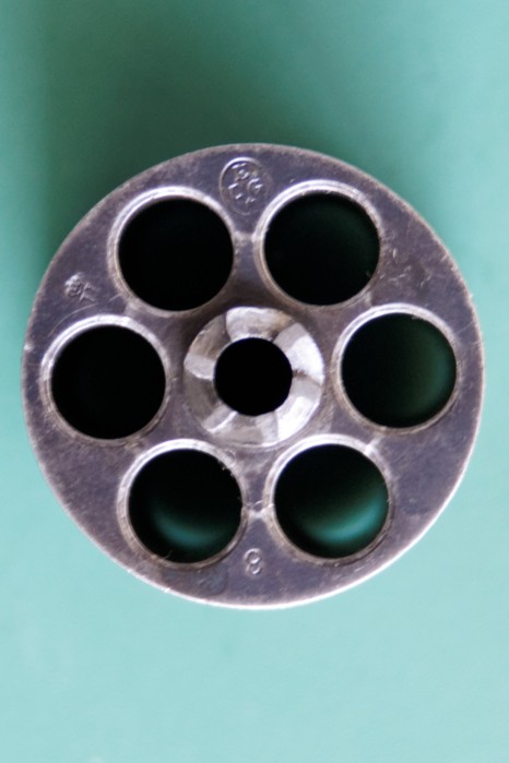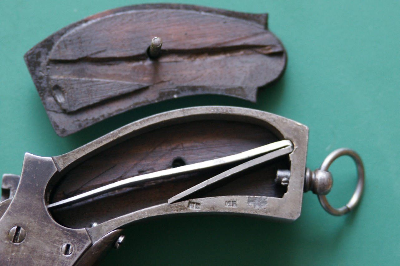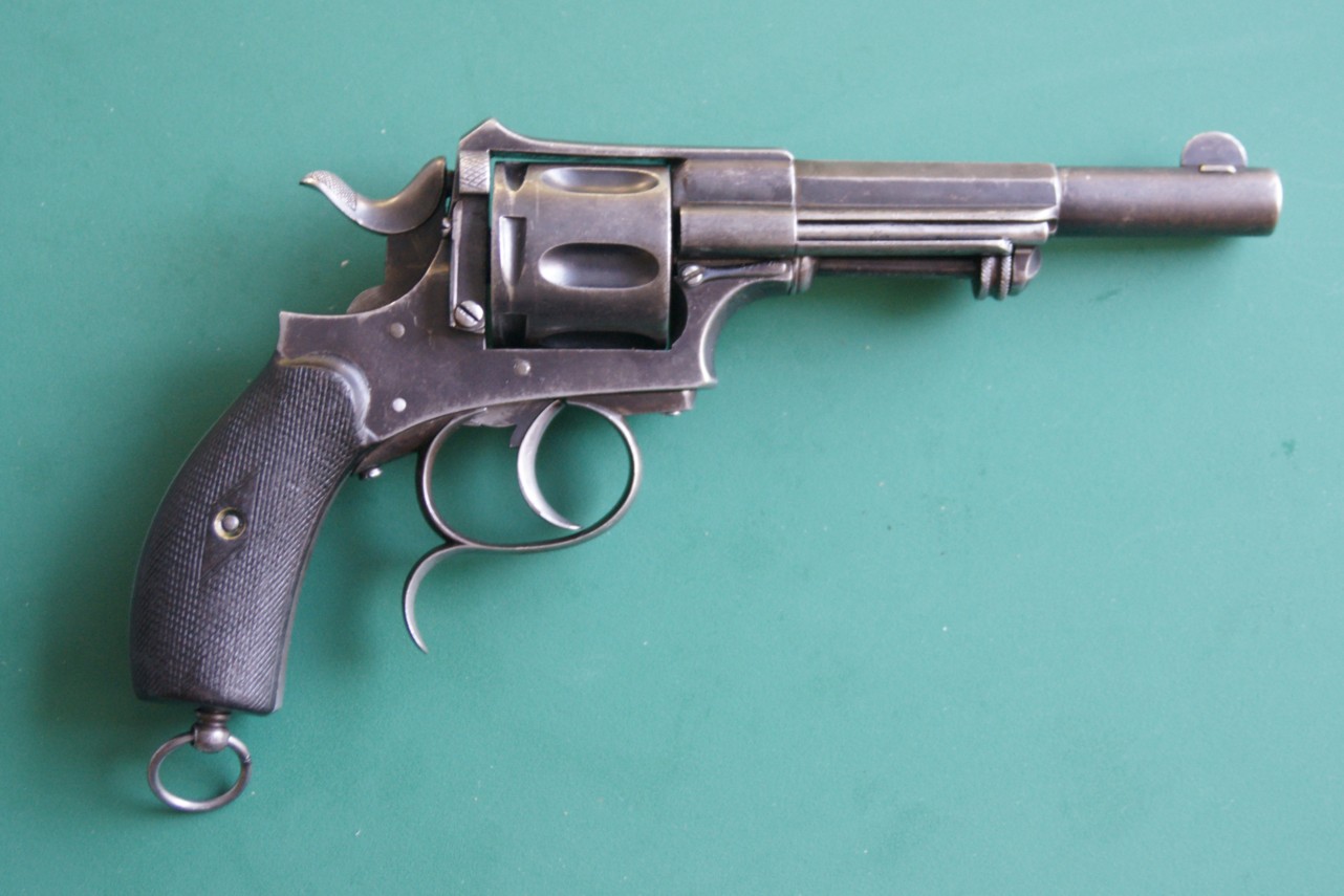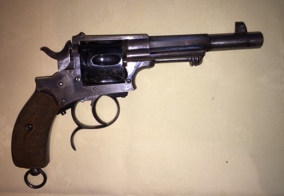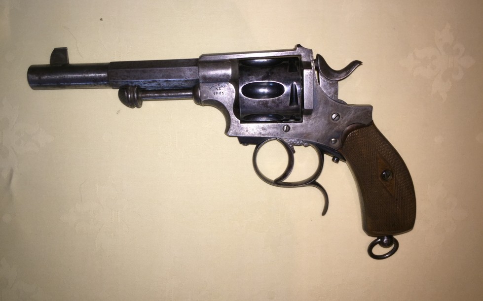 This is a central percussion revolver. The caliber is not indicated on the weapon? The barrel is eight-sided in its first half and then round. It has a V-shaped back sight and a semi-rectangular front sight large enough to be opposite the aiming notch. The barrel probably with 6 shots is hollow. Loading and unloading is carried out by a side door and an embossed push-button at the height of the hammer. The trigger guard is to volute. The butt has two wooden plates (not identified?) gridded + a cap ring and its pivot screw.