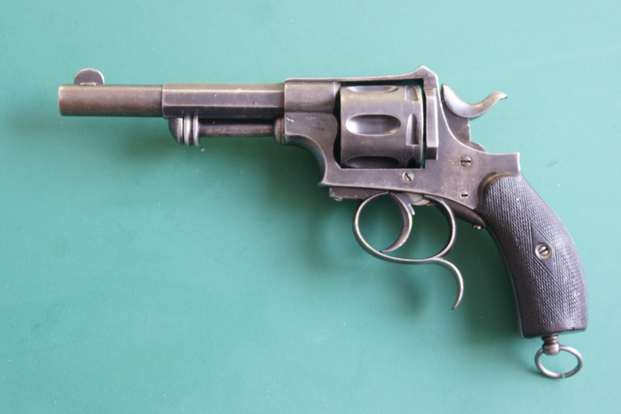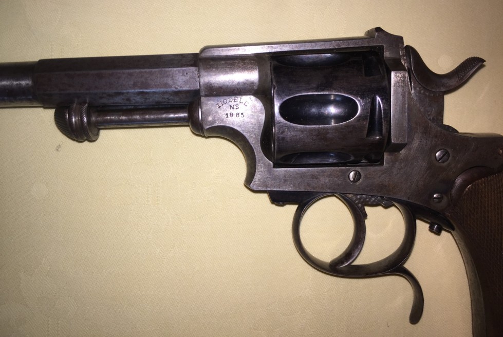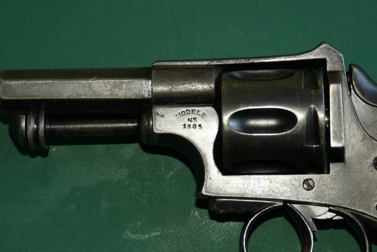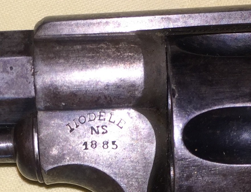 It also bears the manufacturer's mark, Model NS 1885. In any event, it could be the manufacturer Simon Noël, 82 Foxhalle Street and 260 Fontaine Street in Herstal, who filed 10 patents between 1873 and 1892. I have only been able to discover two patents for revolvers which unfortunately do not correspond to the present weapon.