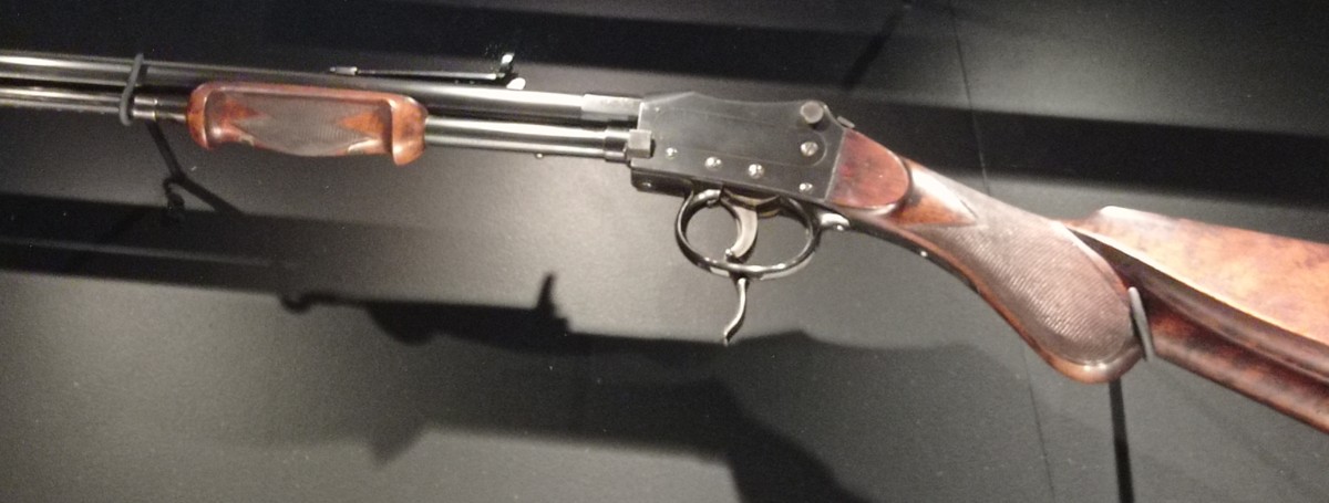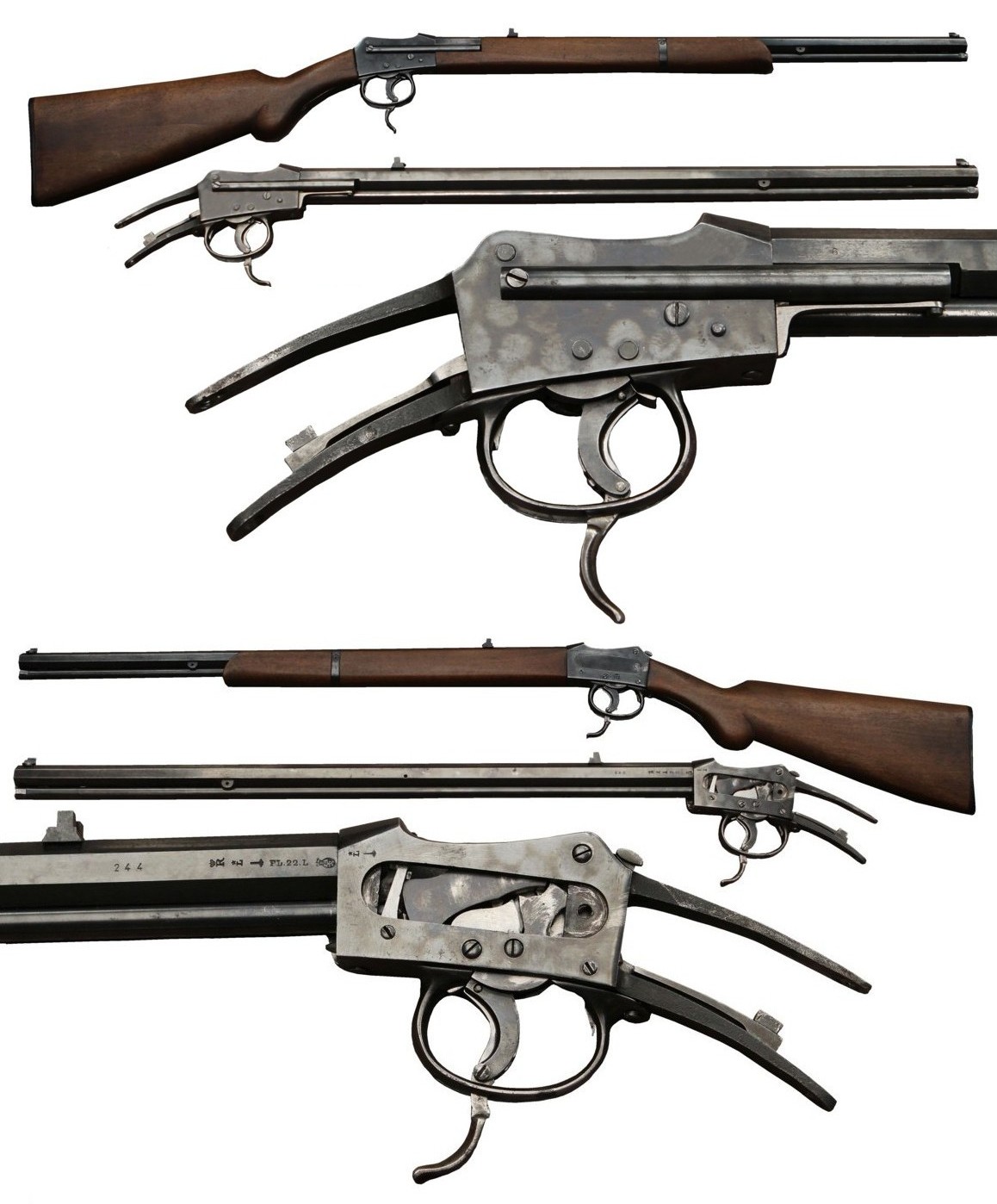 This is an unusual 22 caliber long Flobert rifle. The breechblock is clearly inspired by Martini-Henry. The weapon features an unusual hook extending beyond the trigger guard, whose purpose is likely to trigger the rifle's cocking.