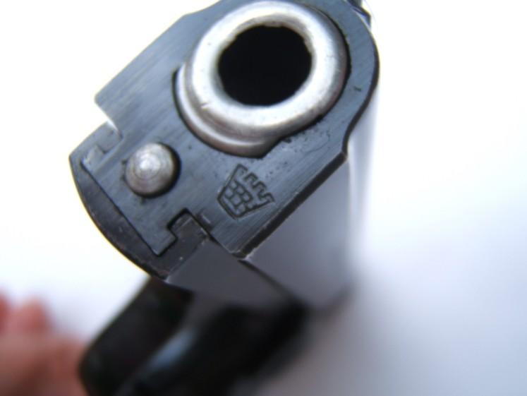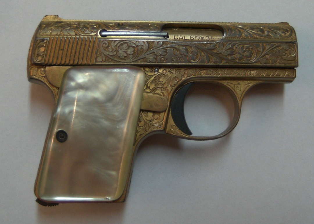 Saive made the older model smaller again. The grip-safety was missing now, the safety lever was enlarged. By it's tiny dimensions it became a typical lady-pistol, and therefore - like the modell 1906 - also engraved and nickle-plated types were produced, which came with mother of pearl grips from the factory.