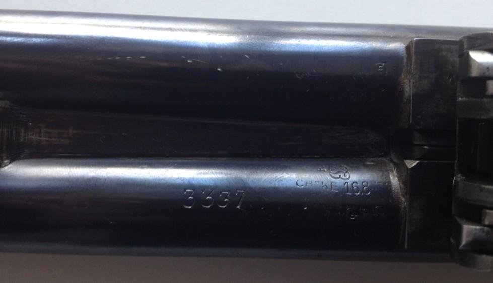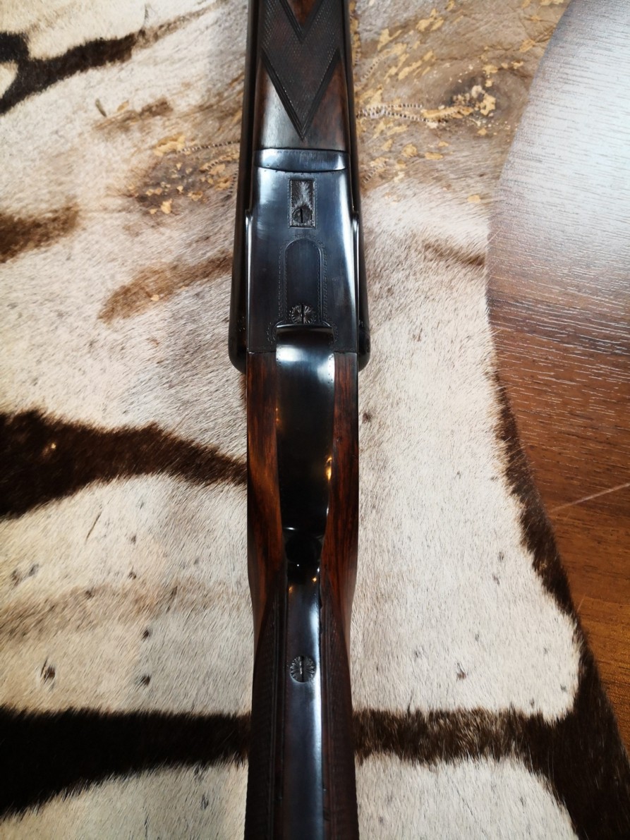 It is a 16 gauge shotgun with smoothbore and side-by-side barrels. The locks are of the forward type and breaking is done with a top key! The walnut wood stock is shaped in the English style.