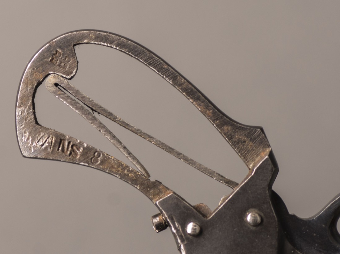 revolvers produits à Liège. Sa poignée en tête d’oiseau, légèrement busquée, est