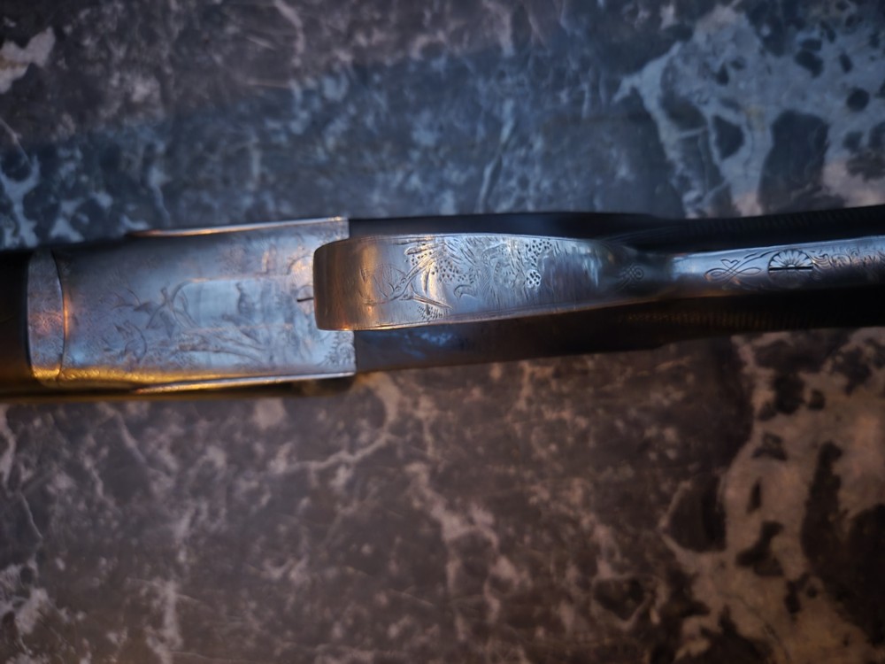 Il s’agit d’un fusil de chasse à canons lisses et juxtaposés de calibre 16. La platine est de type hammerless (chien caché), la clé d’ouverture est de type « top lever » et la sûreté à glissière juste derrière est de type GALAND. Les platines « en avant » sont gravées « à bouquets ».La crosse en bois de noyer (vue partielle) devrait être façonné à l’anglaise (sans poignée pistolet !).