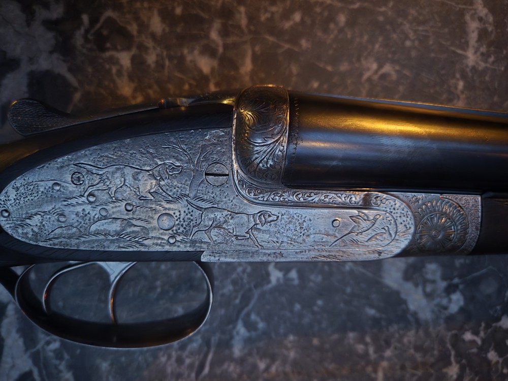 Voici un beau fusil de chasse à deux canons juxtaposés. Le système de percussion est de type « hammerless », avec clé de brisure « top lever ». Les parties métalliques sont artistiquement gravées de scènes de chasse (chiens, gibiers à poils et à plumes), signées A. Gob. Ce graveur a déjà été rencontré sur le site.