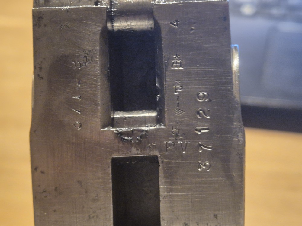 1 écu portant deux lignes ondulées, surmonté de la lettre R avec les dates a) 03.88 et l’autre 76. Ces deux poinçons indiquent que l’arme a subit une ré-épreuve après transformation ou réparation.