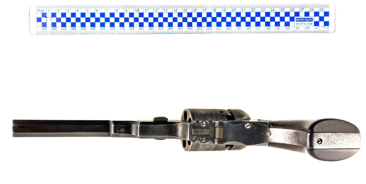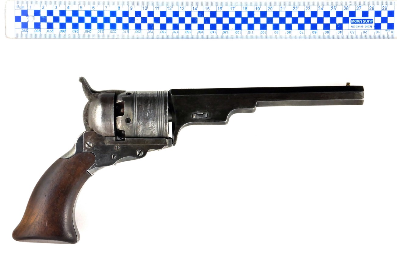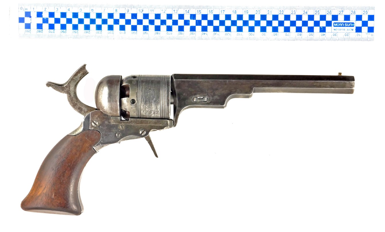 Il s’agit ici d’un Colt « Paterson » fabriqué à Liège, un peu plus tardif de ceux fabriqué par Samuel Colt dans le New Jersey, tirant en simple action. La détente tombant à l’armé.