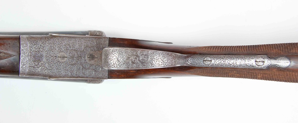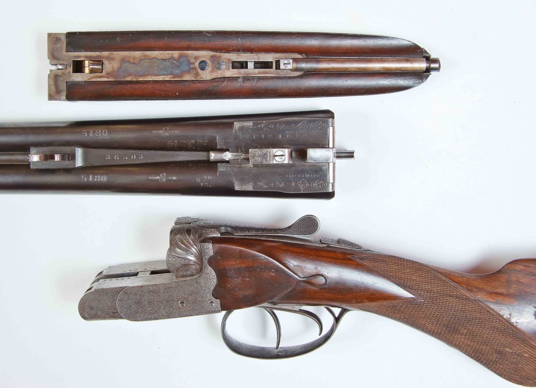 Very beautiful part of great quality! Rifle juxtaposed of gauge 12, locks hammerless, key Top lever, engraving of foliage in hollow bottom, English stick.