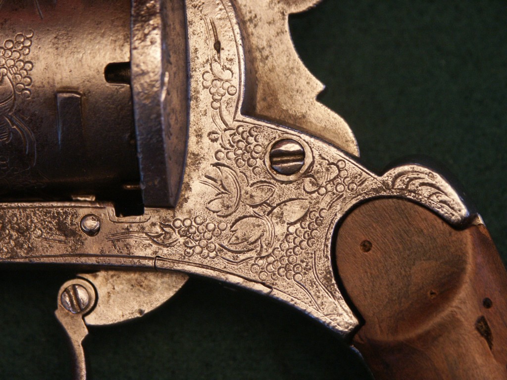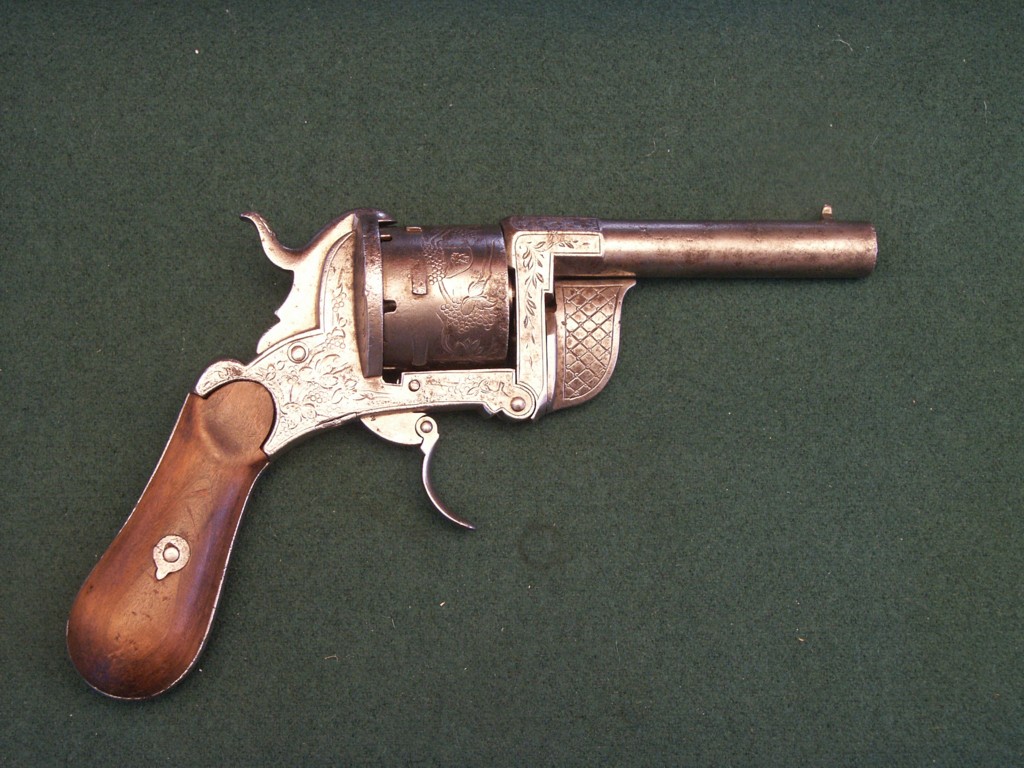 open-frame pinfire revolver, probably in 7 or 9 mm caliber like its counterparts