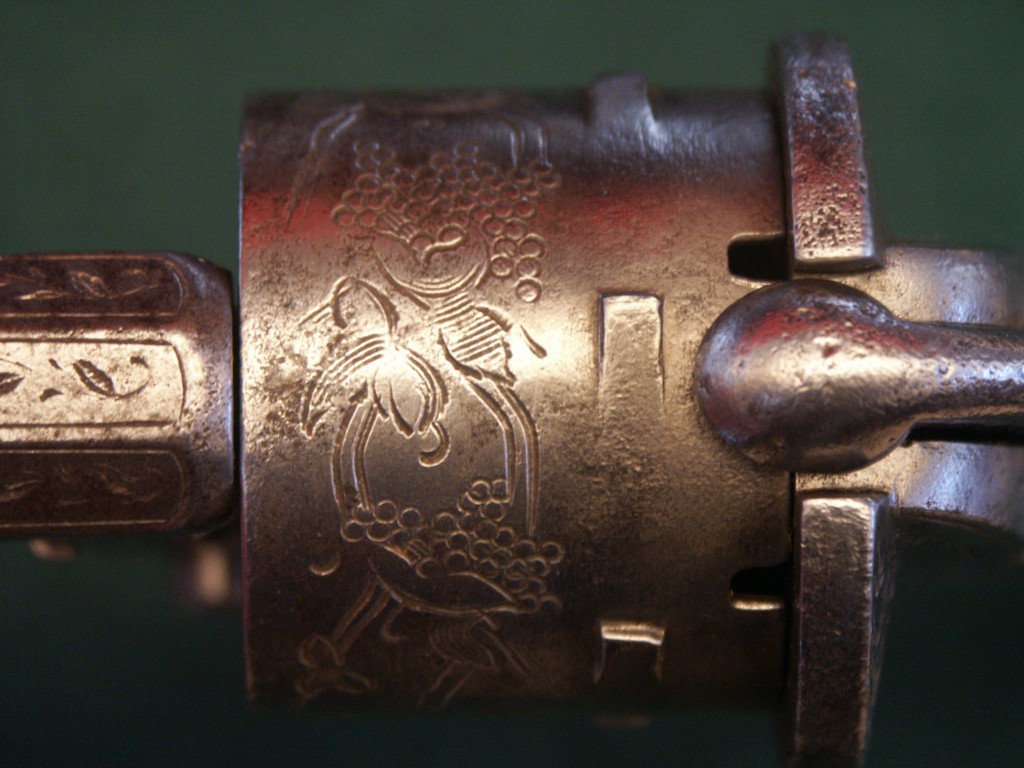 with floral motifs, a retractable trigger, and well-preserved light wood grips.
