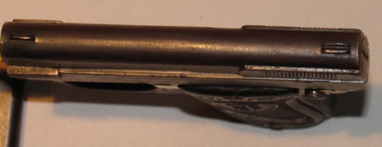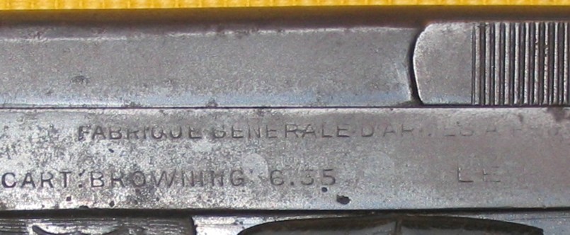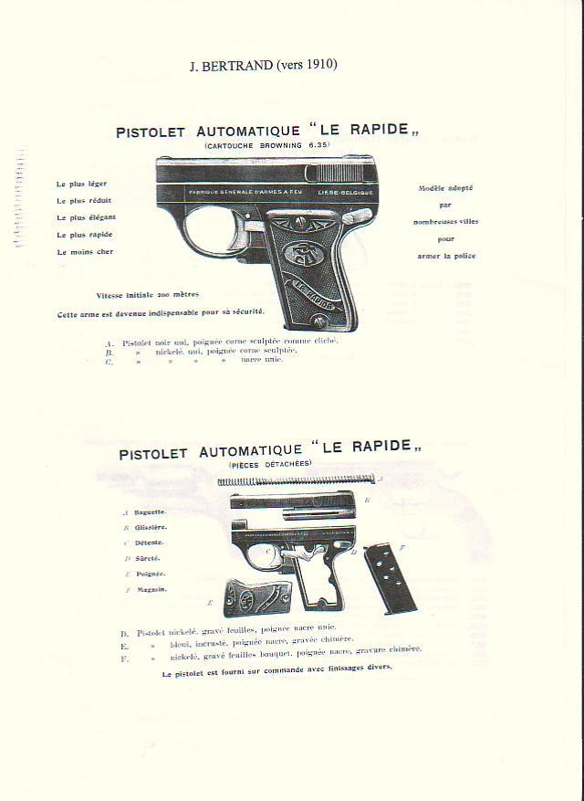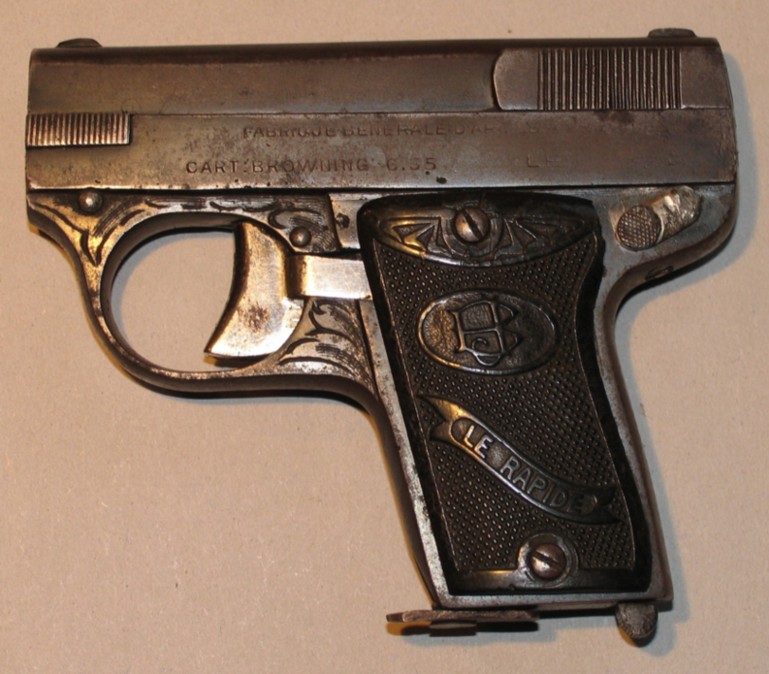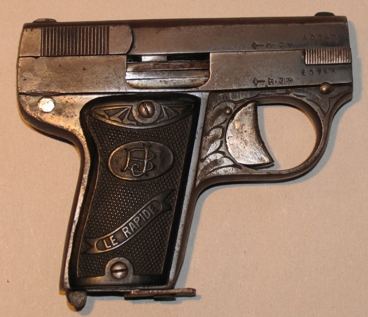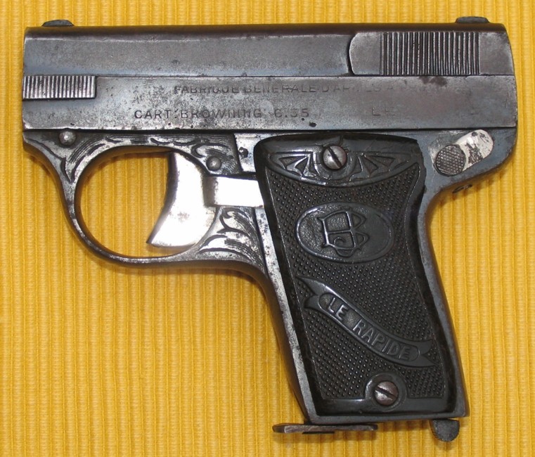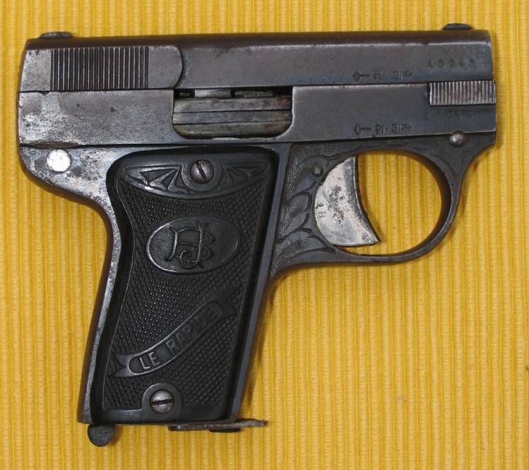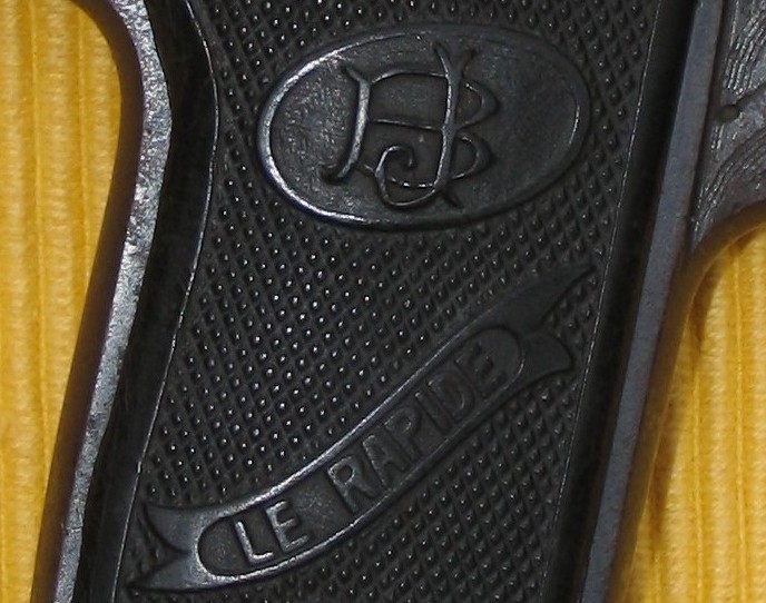 Caliber 6,35 mm, almost identical to the "Continental" mentioned above, besides some modifications concerning the assembly of the trigger. The slide is marked "Manre Grl d' Armes et Munitions Cal Browning 6,35 Le Rapide", while the gripss carry the impression "Le Rapide" and monogram "JB".