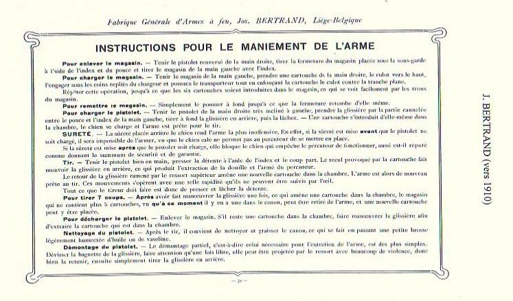 They were guns without any particular characteristics Caliber 6,35 mm or .320, of the"Vélo-Dog" type, very similar in their aspect to similar products provided by many other Belgian manufacturers (who often used the same one names); only the Bertrand monogram "JB" reproduced on the grips made it possible to identify them.