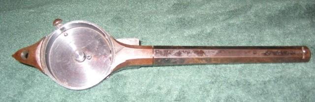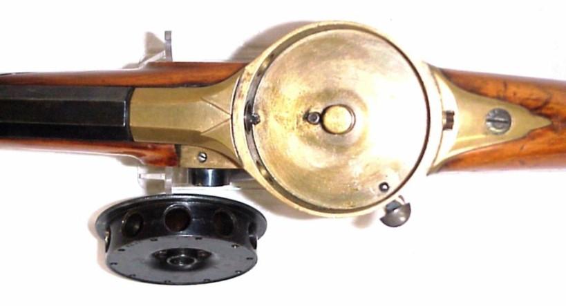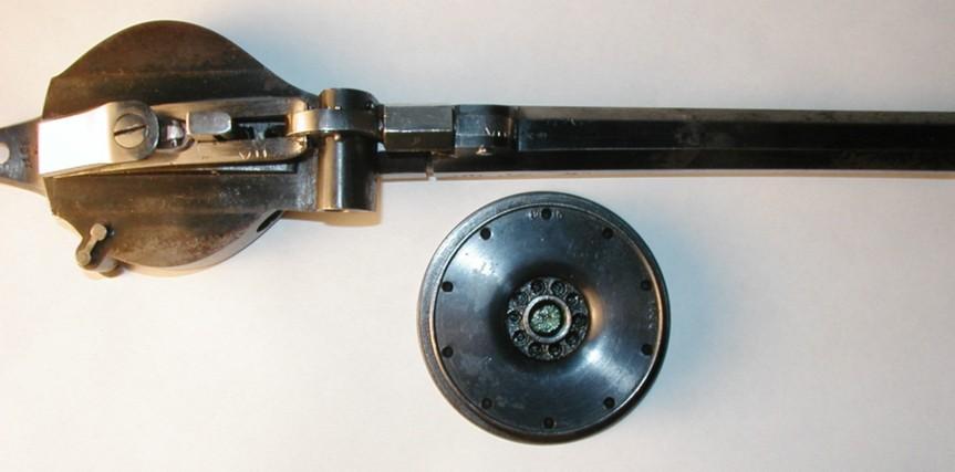 The GENHART revolving carbine is dated 1856. It has a rifled barrel of the 10.5 mm calibre and a similar horizontal cylinder containing ten rounds and also using tube-primers. The cylinder turns on a vertically placed axis and has internal fire channels.
