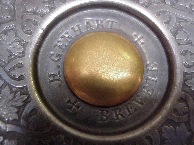 Very few are known about Heinrich GENHART. According to the author John Deane, he was an artillery officer in the Swiss army. He has been registered at the Liège register of arms manufacturers from 1857 to 1859. He seems to have lived in different European countries, especially in England and Belgium, at Liège. The etch below shows him with his weapons.