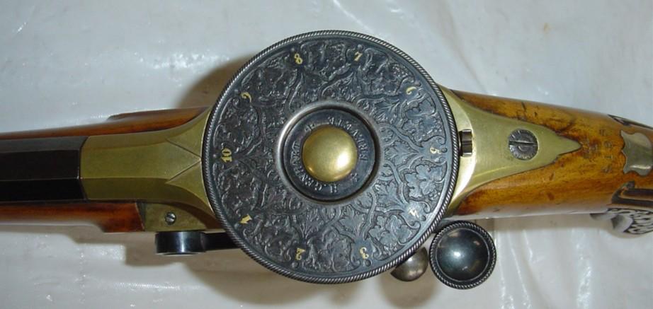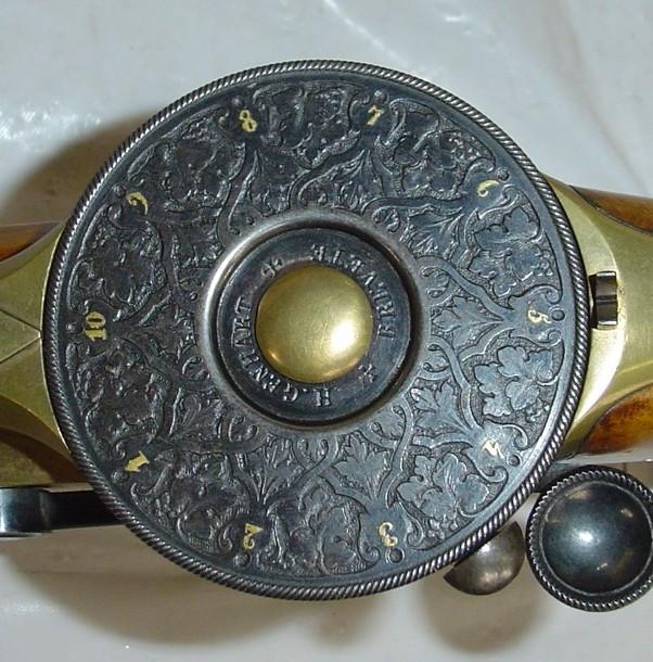 The grip is made of walnut and carved in the Renaissance-style, with a chiselled metallic buttplate. The cylinder lid is black engraved and each chamber is marked by gold inlaid figures from 1 to 10.