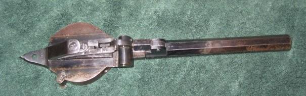 The pistol has a sliding barrel with a laterally placed opening for loading. It has also a graduated cylinder, which turns on a vertically placed axis, and provided with holes for the tube-primers. A laterally placed rod at the left side causes the barrel to slide into the chamber muzzle and also brings the lock mechanism to full cock. The mechanism has a vertically moving firing pin.