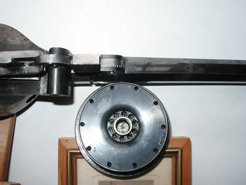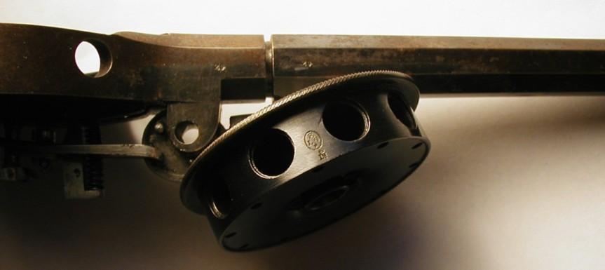 The cylinder has to be taken out the receiver for loading and bringing a new cartridge in line with the barrel. A double opening in the brass receiver allows checking the number of fired rounds. The cylinder can only be removed when the rod has been pushed fully downwards.