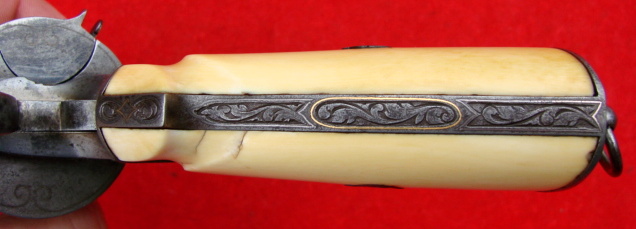 The grips seem to be out of ivory, they are joined together by a through screw and two rivet washers.