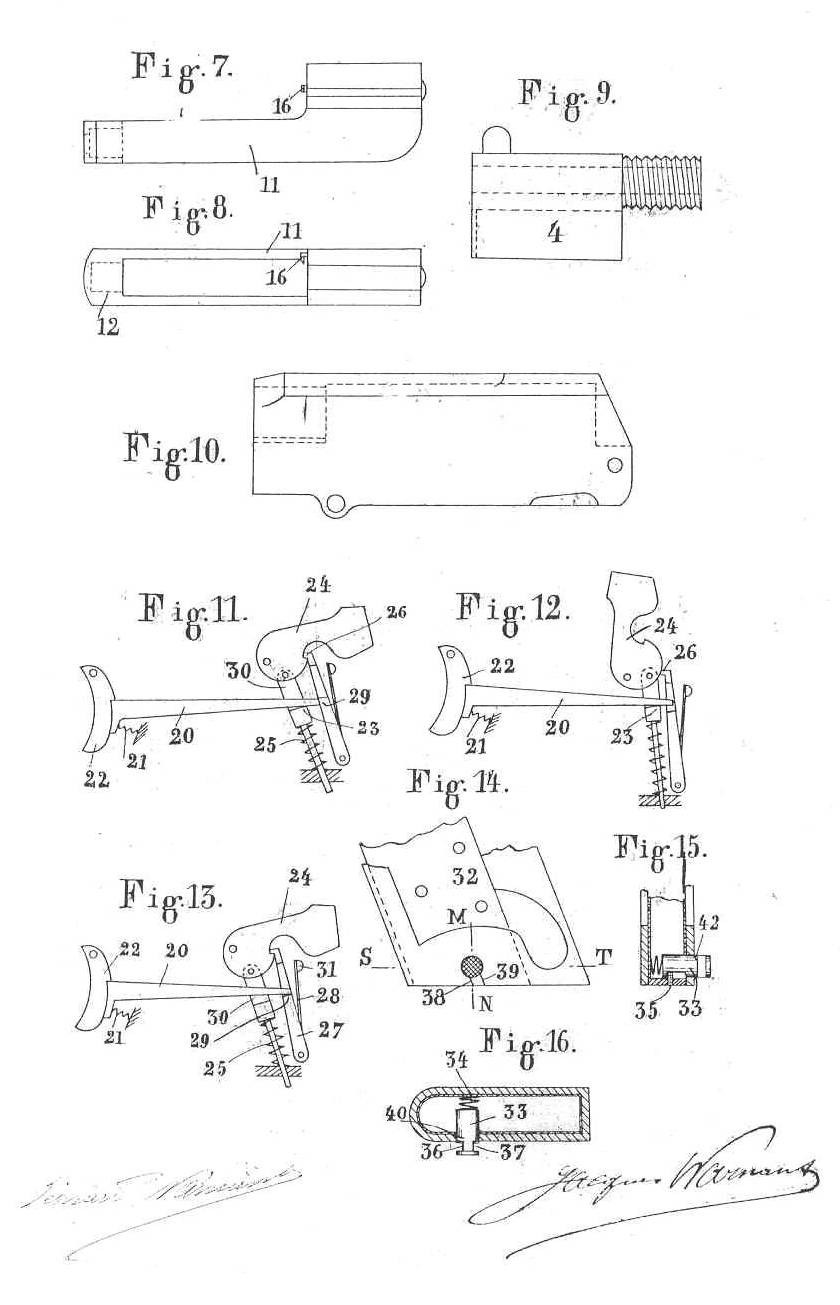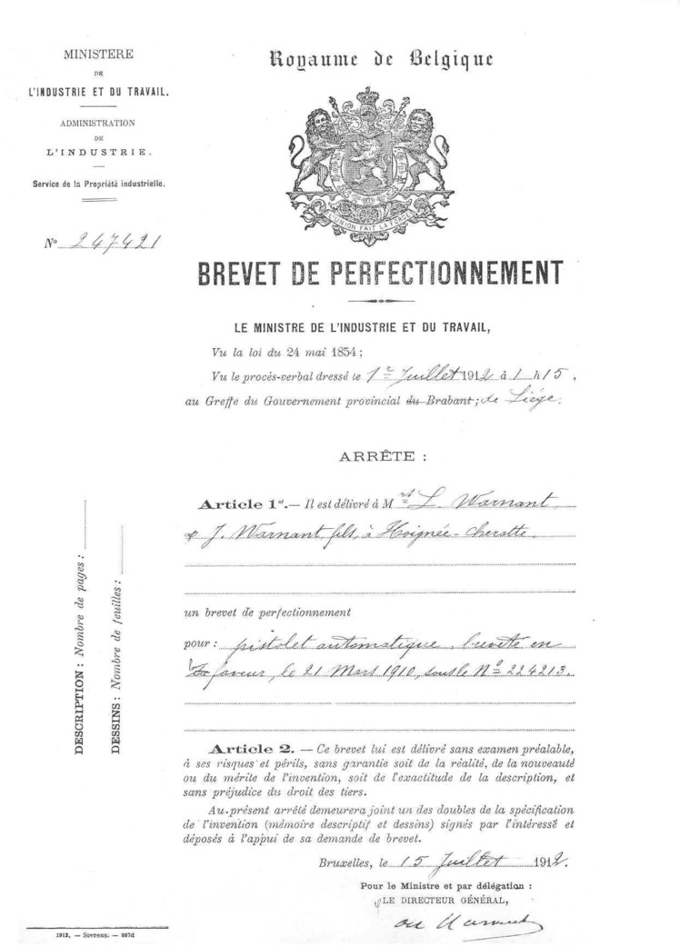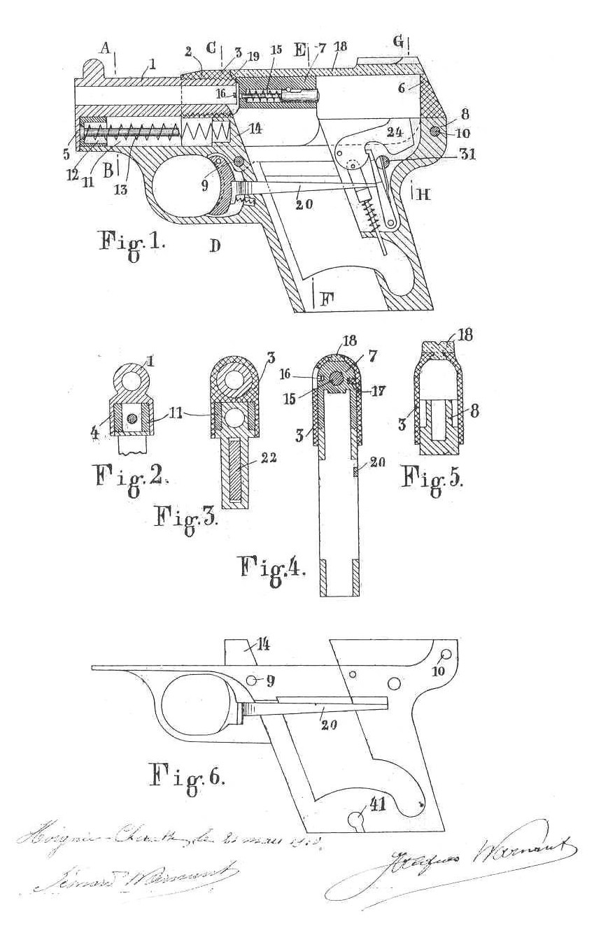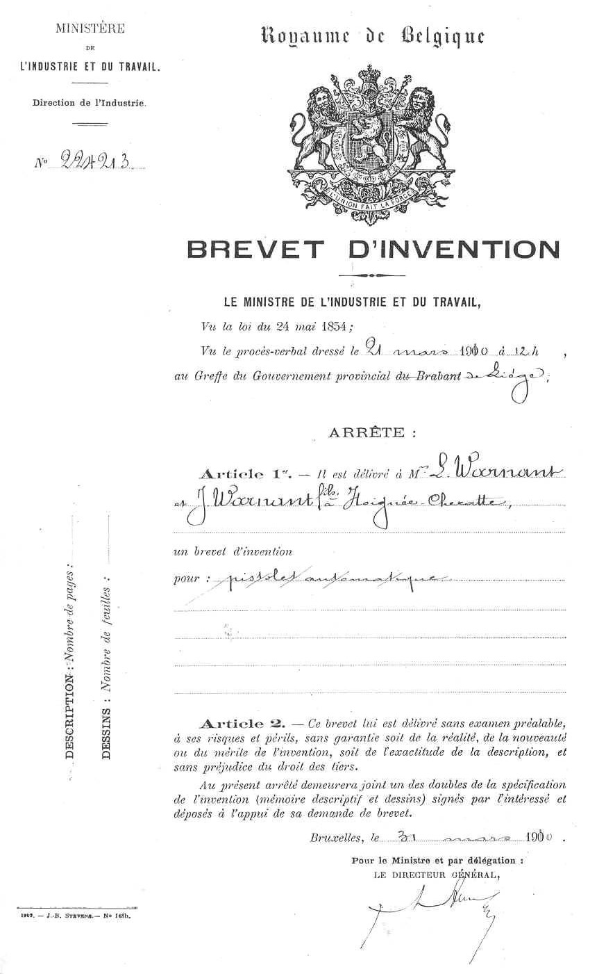 To the beginning of the century, Warnant were dedicated to the automatic guns with many patents and models, but without obtaining much success. Their first attempt to give up the revolver goes up indeed at 1890, date on which they patented (British patent 2543/1890) a gun with repetition “Warnant-Creon” with a breech-block screwed of Martini type and a tubular charger, but probably this weapon was never produced. The first automatic model of gun appeared with British patent 9379/1905 concerning a screwed gun gun which became in fact the Pieper gun, this last having bought the patent.
