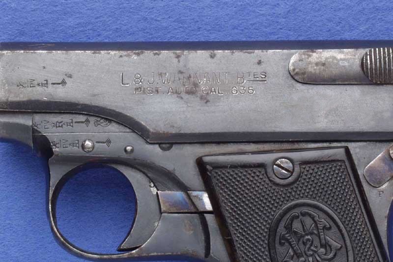 Warnant gauges 6.35 mm was marked "L & J Warnant Bte 6,35 mm", while the handles presented the monogram "L & J Warnant". This gun made its appearance about approximately 1908; few specimens were built less than 2000, before the model does not undergo other changes. Lastly, about 1912, the Warnant brothers produced a gun of 7,65mm It was a completely different model based on the Browning 1903. This model was marked "L & J Warnant Brevetés Pist Auto 7,65 mm". Once again, Warnant did not have a chance; before this gun, which should have been a good commercial success, can be affirmed, the war burst and the production ceased.