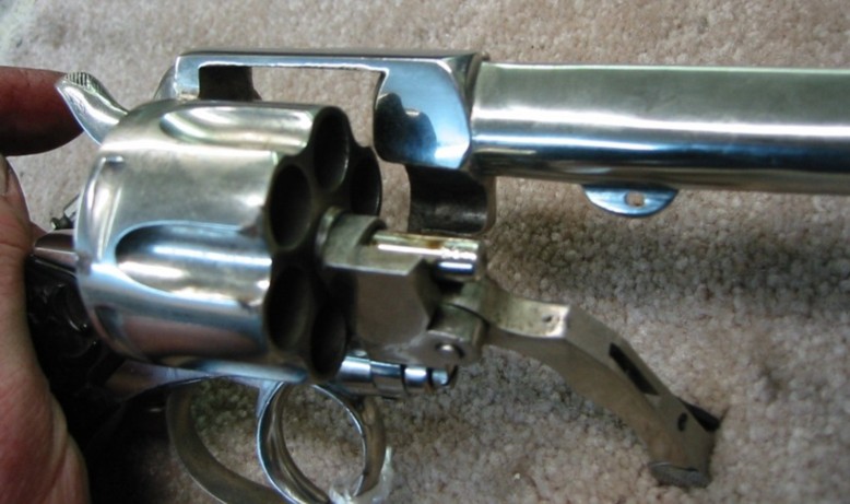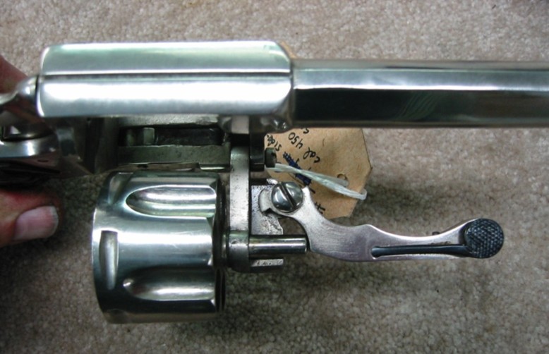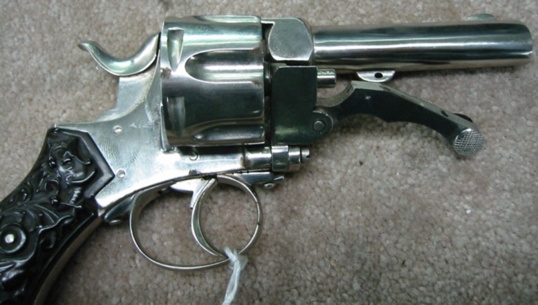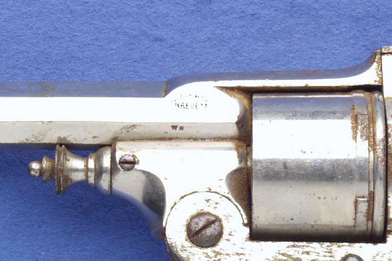 The revolver is marked on the left side of the barrel, "SCW BREVETES". There are also some smaller markings stamped on the frame and on the barrel, but due to the nickel finish wear they are unrecognizable ("GB"(?) in the circle). The design represents early Belgian self-extracting revolvers. The maker of the gun used several revolver designs as his inspiration. Hinged frame design was probably adapted from S&W. Single tang breech latch of J. Warnant patent. House of Liege proof is stamped on the cylinder. Six shot. Barrel length: 5.50 inch. Calibre 11mm.
