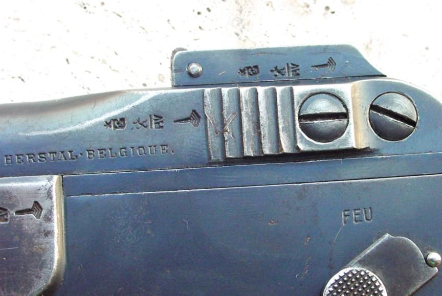 Chinese Copy of Browning 1900 semi-auto pistol. Marked on the left side of the frame: Browning S Patent. The other markings do not make much sense, as they seem to be a combination of European letters that do not create any words(GUERREHERSTALGUERRE....). Some unrecognizable proofs are present on the left side of the frame.