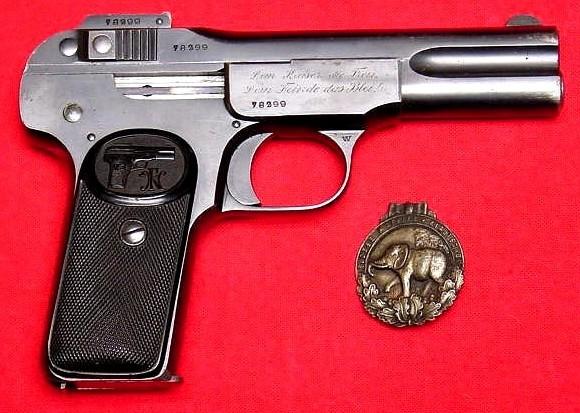 This unusual FN Browning Model 1900 was presented to Lt. v. Barsewisch about 1903.
