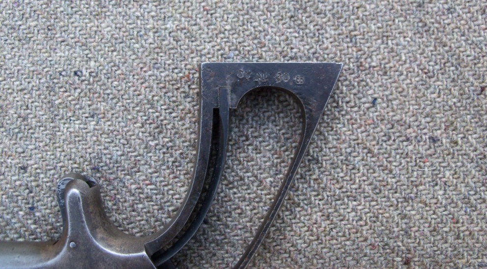 AS, nombre 30 (numéro de série ?) et autres marquages indéchiffrables sous plaquette droite.