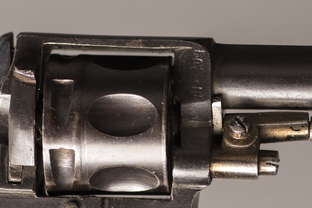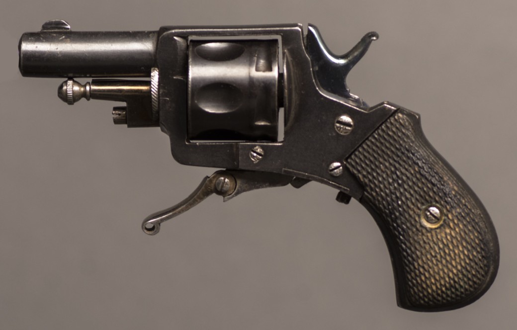 Here is a small Puppy revolver in 320 caliber black powder. It is a very classic example of this category of pocket weapons that flooded the European market (also very present in the USA) during the last quarter of the 19th century. It is a variation of the concept of the RIC and Bull Dogs revolvers introduced in Birmingham by Webley during the 1870s. These small revolvers were produced by many craftsmen in England, Spain, Germany, and Belgium. Distributed in gun shops and bicycle stores, but also by catalog (Manufrance for example), they supplanted the pepperboxes and small-caliber Lefaucheux revolvers thanks to their convenient (for the time) loading and unloading system as well as their centerfire ammunition, more powerful and easier to handle than pinfire ammunition. It was the widespread use of smokeless powder handguns from the end of the 19th century that gradually led to their decline until the First World War. This bronzed example features a retractable trigger, as is often the case with small revolvers produced in Liège. Its slightly arched bird's head grip is fitted with checkered wooden grips. It is a simple, unpretentious weapon, but it appears to be of good quality, and its six shots are well-suited to fulfilling their purpose at the time: to reassure its owner. Indeed, its size and lightness are designed to be easily carried in a pocket or handbag.
