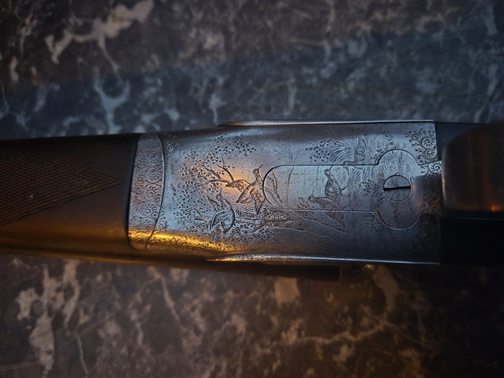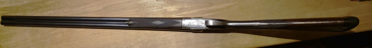 Il s’agit d’un fusil de chasse à canons lisses et juxtaposés de calibre 16. La platine est de type hammerless (chien caché), la clé d’ouverture est de type « top lever » et la sûreté à glissière juste derrière est de type GALAND. Les platines « en avant » sont gravées « à bouquets ».La crosse en bois de noyer (vue partielle) devrait être façonné à l’anglaise (sans poignée pistolet !).
