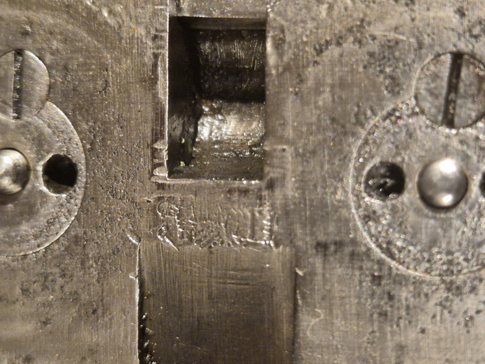 1 écu portant deux lignes ondulées, surmonté de la lettre R avec les dates a) 03.88 et l’autre 76. Ces deux poinçons indiquent que l’arme a subit une ré-épreuve après transformation ou réparation.