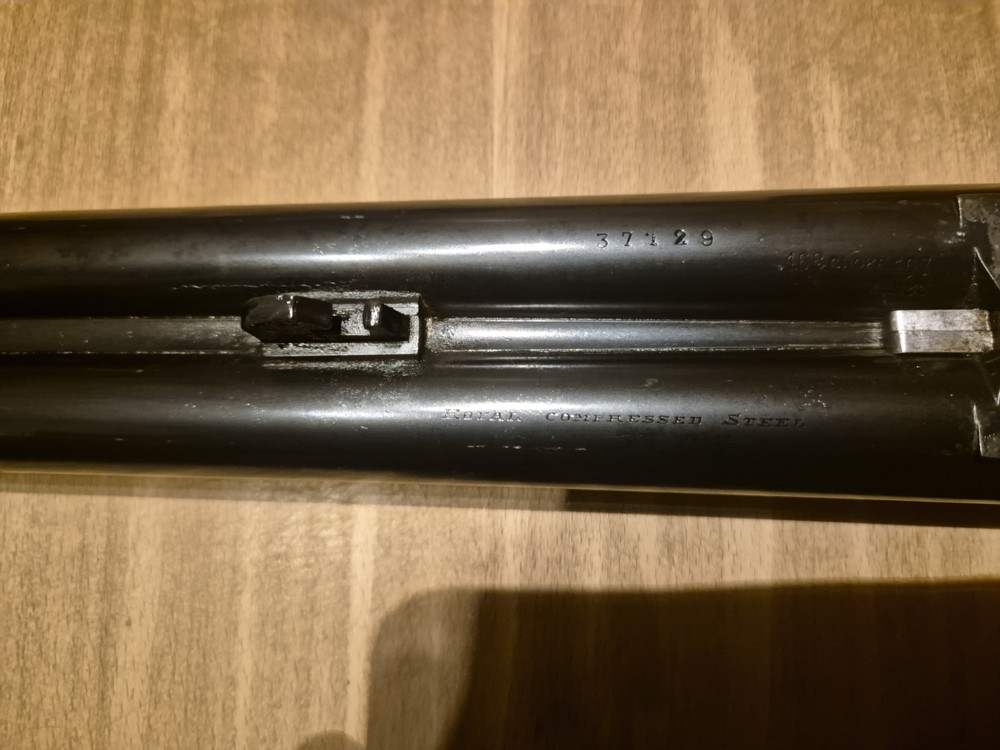 « Royal Compressed Steel » sur le canon : fabricant du canon. NB : les fusils de Forgeron connus sur le site possèdent des canons aux différents marquages (Cap, Falla, Royal Compressed Steel avec ou sans couronne), ce qui suggère qu’il avait recours à la sous-traitance pour les canons.