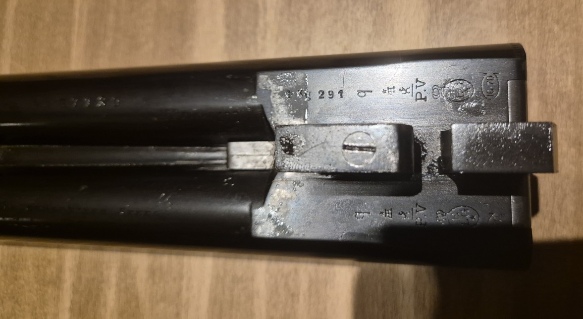JSE dans ovale allongé : quasi certainement la marque du célèbre armurier maison John Springer’s Erben, qui a vraisemblablement vendu le fusil en Autriche (et peut-être allongé les chambres à 70 mm ?) ;