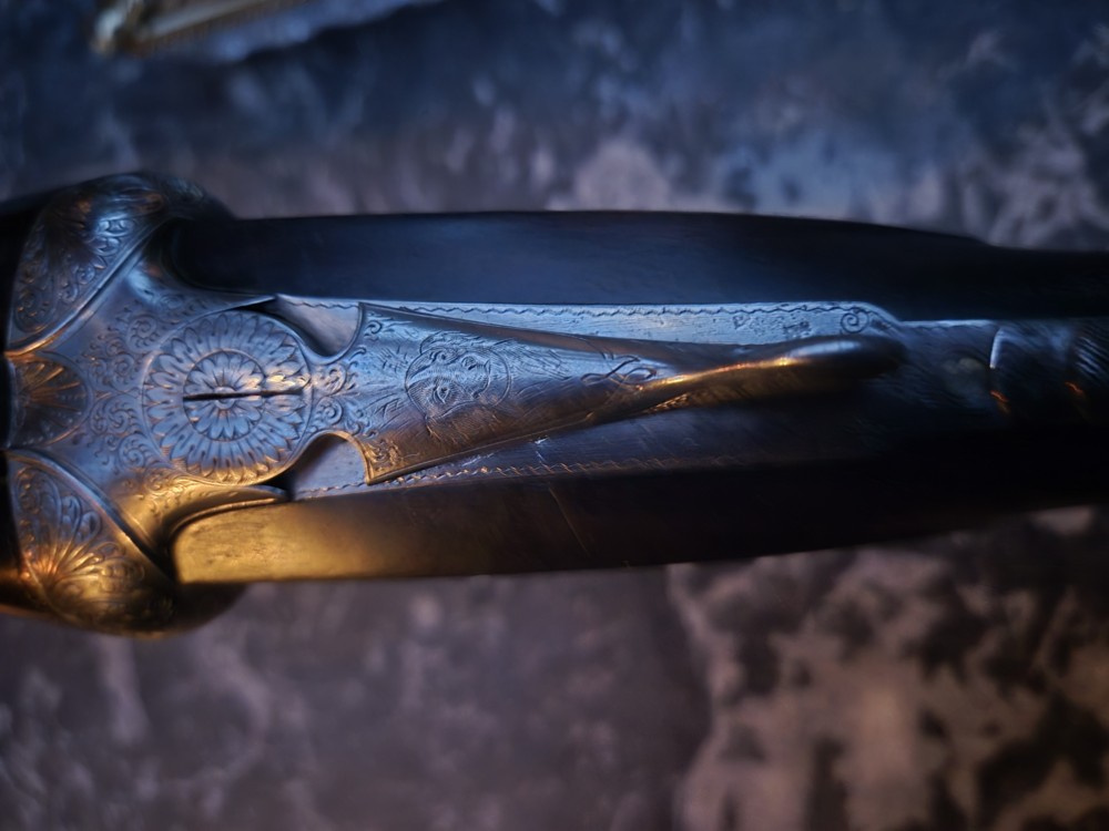 Les platines hammerless, avec clé top lever, sont joliment gravées « à bouquet » sans qu’aucune signature de graveur soit cependant visible.