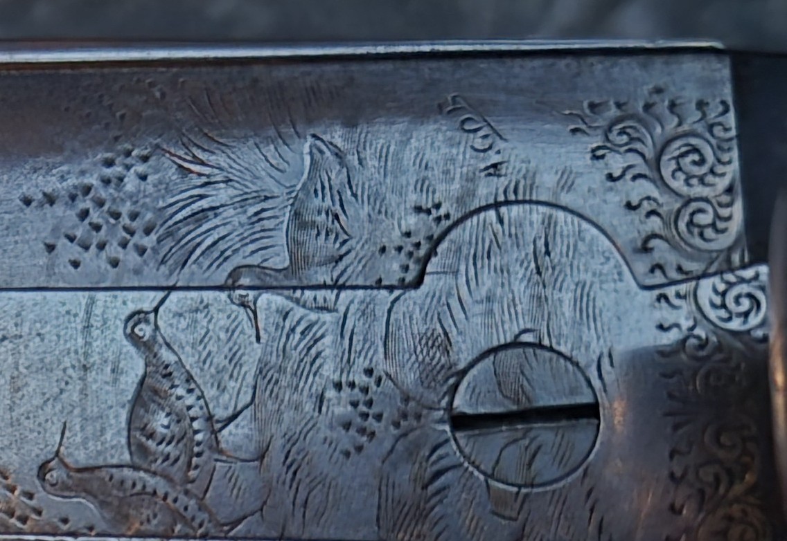 Voici un beau fusil de chasse à deux canons juxtaposés. Le système de percussion est de type « hammerless », avec clé de brisure « top lever ». Les parties métalliques sont artistiquement gravées de scènes de chasse (chiens, gibiers à poils et à plumes), signées A. Gob. Ce graveur a déjà été rencontré sur le site.
