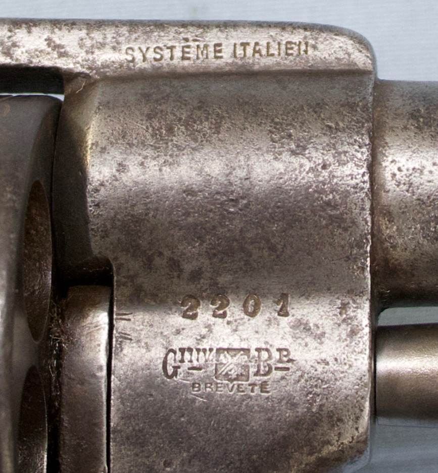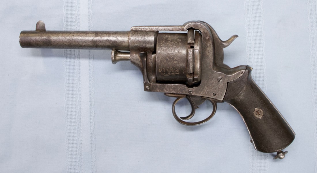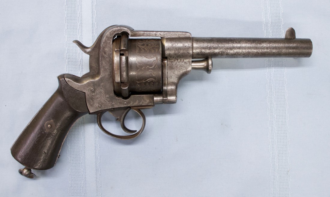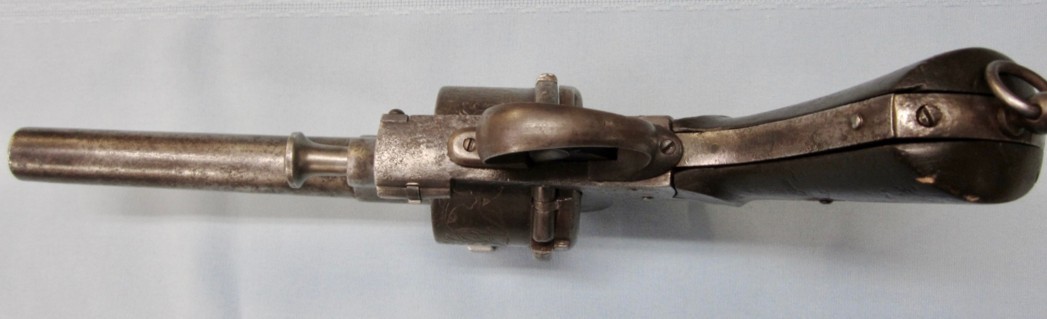 Voila un grand (très grand) revolver à broche conçu par l'armurier italien Alexandre Guerriero, qui a breveté son modèle en Italie mais l'a fabriqué en Belgique. Je pense donc qu'il serait considéré comme une arme à feu belge en raison de son lieu de fabrication. J'ai vu des photos de deux de ces revolvers en meilleur état que celui que nous avons trouvé, mais le nôtre est un très bon exemplaire et porte une gravure, ce qui manque aux autres exemplaires.