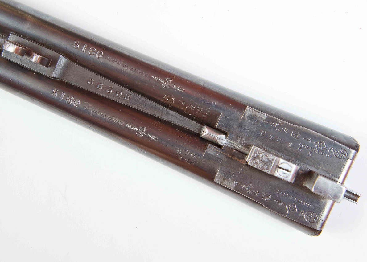 Very beautiful part of great quality! Rifle juxtaposed of gauge 12, locks hammerless, key Top lever, engraving of foliage in hollow bottom, English stick.